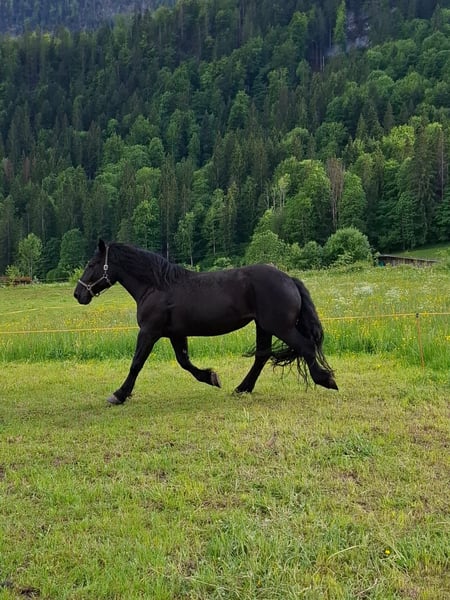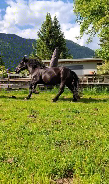 We would like to part with our Noriker mare Nelli, as we are discontinuing the breeding of this color variant. Nelli has already participated in several parades (including the Leonhardi and Georgi rides) and has always handled them bravely and reliably. She is very robust, has never been sick, and is bred every year. Currently, she is barefoot, but has always been shod without issues for parades. In the herd, she shows a rather low rank. Under saddle, she is usually well-behaved and engaged, but occasionally has her own ideas. Therefore, we do not offer her as a pure beginner horse. Nelli was registered in the studbook with a score of 7.59.