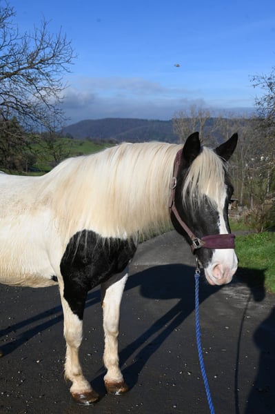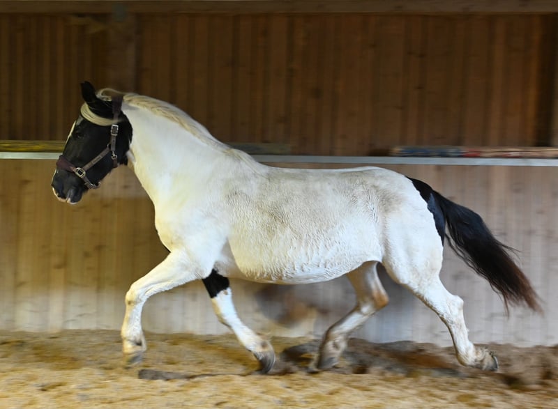 Jasmina was born on May 21, 2017, she is approximately 161 cm tall and has a very lovable and good-natured character. Additionally, she has an incredible charisma that captivates people. She is very well ridden, both in the arena and on trails. She is currently being used in our riding school and can also be ridden well by beginners. She is fearless and traffic-safe. Jasmina has been registered as a breeding mare in the studbook with a score of 7.50, and so far she has had 3 filly foals, 2 of which are pinto and one is a black foal, all of good quality. She is in foal to Hennessy Schaunitz for spring 2026. Jasmina has a good neck and a very well-split croup, good basic gaits with a very nice, spacious trot. She is shod all around and this should remain so; she has been tested free of PSSM1, vaccinated, and regularly dewormed. Jasmina loads calmly into the horse trailer and is farrier-friendly. Sire: Firon Elmar, Dam Sire: Lotto Vulkan