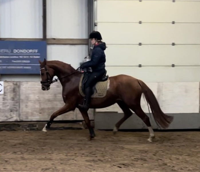 Heeft erg goede gangen maar zit onder zadel nog werk in. Paard is eerlijk en niet gevaarlijk! Moet beter leren omgaan met eigen spanning. Filmpjes aanwezig. Zachte mond. Ideaal project voor iemand die er tijd in wil steken. Als 4 jarige enkele dressuurwedstrijden gelopen. Thuis ook weleens gesprongen. Wordt alleen verkocht naar goed tehuis, merrie hoeft niet weg maar op dit moment is er geen geschikte ruiter die haar op lange termijn door kan blijven rijden. Zou ook geschikt zijn als fokmerrie. Clean X-rays.