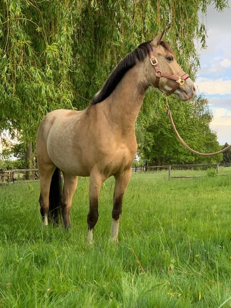 Vielseitiger Ambitionierter Wallach Le Beau Filou sucht ein neues 5* Zuhause. Filou ist ca 142 cm groß und 14 Jahre alt. Er ist ein Niederländisches Reitpony. Er verzaubert nicht nur mit seinem Bildschönen Aussehen sondern auch mit seiner verschmusten und freundlichen Art. Filou ist in der Dressur sicher in einigen L Lektionen ausgebildet. Auf dem Turnier ist er bis A* vorgestellt und sowie platziert. In der E Dressur sowie im Springen war er bereits Siegreich. Auch im Springen zeigt er sehr viel potenzial. Hier ist er bis A* auf dem Turnier vorgestellt worden und im Training ist er auf gutem A/L Niveau. Auch durch einige Reitabzeichen 4 und 5 hat er seine Reiter zuverlässig getragen. Er kennt den Alltag mit Kindern und bleibt hierbei stets entspannt. Derzeit wird er von einem neun jährigen Mädchen an der Longe geritten. Er war mit dem Ponyshowteam (Springquadrille) auf Messen wie z.B. der Equitana unterwegs und ist dort in Shows aufgetreten. Filou geht gerne in einer Gruppe als auch alleine ins Gelände. Dinge wie mit Halsring oder ohne Sattel geritten zu werden meistert er ohne Probleme. Filou ist Verlade und Schmiedefrom. Sowie Entwurmt, Geimpft und Tuniereingetragen. Eine große AKU aus 2025 ist bereits vorhanden. Ebenso hat er eine OP Versicherung, die gerne mit übernommen werden kann. Bei Interesse melden Sie sich bitte unter 0176-41237626 per WhatsApp oder SMS