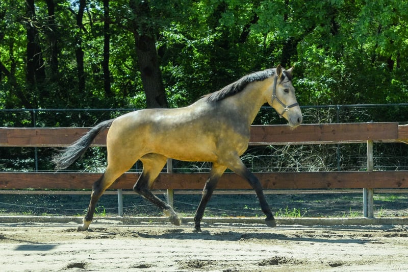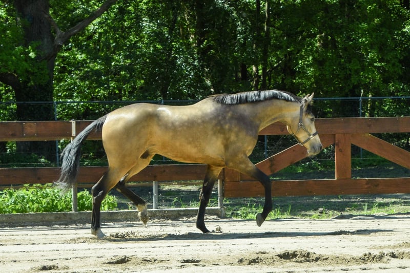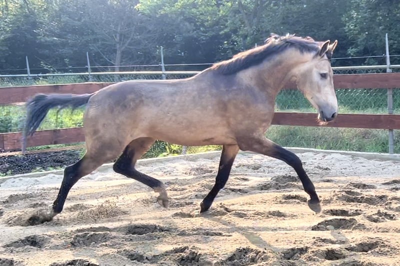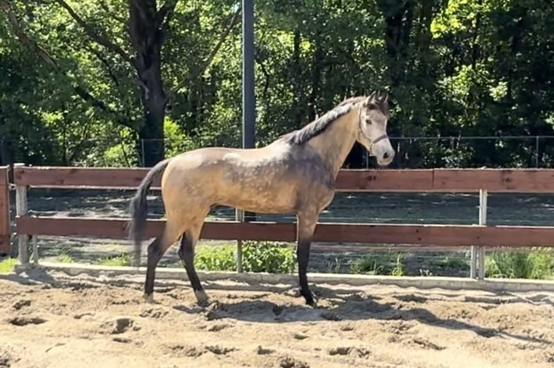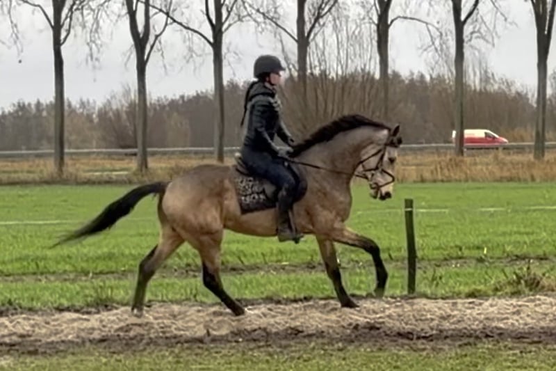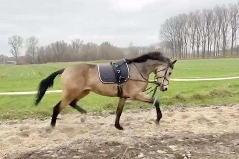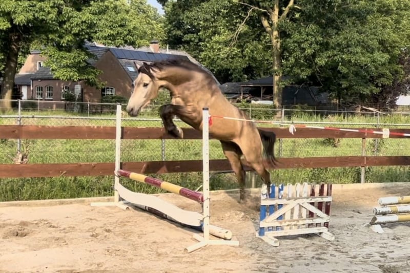 Westland van de Teugenaar is a 4 years old allround NRPS gelding. He measures now 1.67m and is expected to grow around the 1.69/1.70m. With his beautiful buckskin color, he's a real eye-catcher! CLEAN X-RAYS! Westland has a very interesting pedigree that combines dressage and jumping: Whatever van de Teugenaar (Whiteyassar x Montreal VDL x Emilion x Alme) x Discovery x Jonggor’s Weyden. We've owned his dam for 14 years now and she competed at Z1 dressage level with us and also jumped at 1.20m level before (she has been used as a breeding mare / broodmare in the last years). She also has the "Performance Sport" and "Keur" predicates and is WFFS-free. She is a Discovery x Jonggor’s Weyden. Behind Discovery are the stallions Dolany, Donnerhall, Donnerwetter Lorentin I, and Loutano, all of whom have competed at Grand Prix level. Donnerhall has over 160 approved sons and also got a lot of victories! Donnerhall achieved an individual third place (bronze) and team gold at the World Equestrian Games in Den Haag. At the World Championships in Rome, the German dressage team won a gold medal. Jonggor’s Weyden is the dam's sire and competes at Grand Prix level. He is the only approved dressage stallion in the world to ever win an individual medal at the Olympic Games. At the Atlanta Olympics, Jonggor’s Weyden, ridden by Sven Rothenberger, produced team silver and an individual bronze medal. In Westland's damline, you'll find, in addition to many other awards, the stallion Aktion, who also competed at Grand Prix level. Further back in the damline, we also find the stallion Pion, who was a Z2 dressage stallion and a 1.40m show jumper. There's also Akteur, who was a 1.60m show jumper. Westland's sire is the buckskin stallion Whatever van de Teugenaar (we also bred him ourselves). After successfully competing in his first competitions in the Netherlands, including two appearances at the Regional Championships with an amateur rider, he was sold to a French show jumper who also competed him in Belgium. He is now based in Italy, competing at 1.30m and being further prepared for higher-level. He is approved by the EU-recognized RBP Studbook and is out of the approved Cremello show jumping stallion Whiteyassar (who has passed away). He also comes from a very good damline, combining both sport and predicates. This line includes the renowned show jumping stallions Montreal VDL, Nimmerdor, Emilion, Wellington, and Alme, all of whom jump at 1.60m level. The renowned stallion Indoctro, who jumped at 1.40m level, is also in this line. His dam competed at 1.20m level under several riders in Belgium, the Netherlands, and France. Westland has a promising and allround pedigree. He is suitable for dressage, show jumping, and eventing. We just started to make him saddle broken. He knows the bridle, saddle and the lunge. He’s under the saddle for 2 weeks now. He has no (stable) vices! He has also CLEAN X-RAYS (without any remarks)! Pedigree: https://www.horsetelex.nl/horses/pedigree/2314022/westland-van-de-teugenaar The second-to-last photos are of the dam (Discovery x Jonggor's Weyden), and the last photos are of the sire, Whatever van de Teugenaar (Whiteyassar x Montreal VDL x Emilion x Alme). Asking price € 18.000