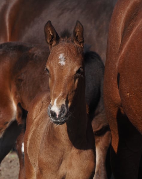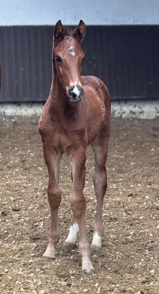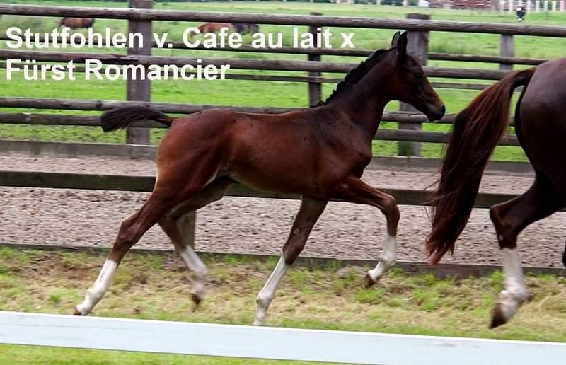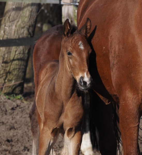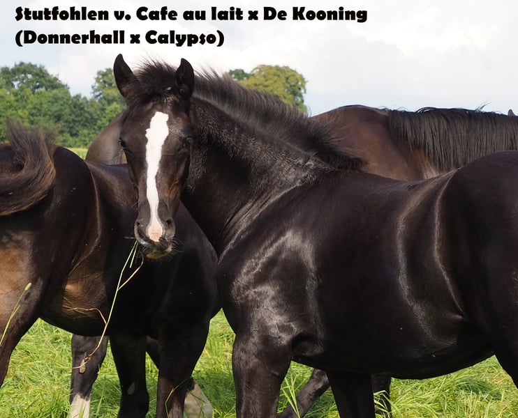 Very typey young stallion with first-class double pedigree! Just one week old in the photos. His dam's sire "De Kooning" has already produced Grand Prix horses such as Dalou Shan despite very limited use at stud and, as a direct son of the unique Donnerhall, has a lot of Holsteiner blood on his dam's side. Despite a small number of offspring, he has already produced a number of licensed offspring, including a premium stallion in Neustadt Dosse, the dressage winner in Munich-Riem and another premium stallion! The sire Cafe au lait, winner of his licensing, HLP winner and BuCha finalist, was himself victorious in the advanced classes and has made a name for himself in recent years as a double sire with top offspring. Cafe's Casimir" (Cafe au lait x Calido x Grannus) was the celebrated top prize winner at the Oldenburg Elite Auction, is a serial winner in advanced (S) level dressage competitions at a young age and has won Intermediaire I internationally. Kasselmann's mare Cafe's Caletta (Cafe au lait x Calato) has also already placed in advanced (S) level dressage and won Grand Prix internationally. Cafe's Matts (Cafe au lait x Don Frederico) was the second most expensive dressage horse at the Oldenburg Summer Mixed Sales. Other young horses out of jumping-oriented broodmares have already been placed several times in tests for young dressage horses at advanced (A) to medium (M) level and are remarkably strong-moving and clear-headed. There is no doubt that the Cafe au lait offspring are convincing in show jumping up to advanced level, for example from our breeding program: Cafe's Champus: licensed, Vice World Champion for young horses Cafe Junior: licensed, internationally successful in Saudi Arabia Cafe's Columbo: licensed and successful in sport in France Cafe's Don Rubin: licensed, 4 years old, as youngest horse bronze at the Dobrocker Deisterchampionat Stationed at Paul Schockemöhle, Cafe au lait has already sired a number of internationally successful show jumpers, including "Royce", victorious in the FEI CSI5* $500,000 Rolex Grand Prix Wellington. Cafe au lait himself was a Bundeschampionat finalist under Philipp Weishaupt and has been successful up to advanced (S***) level show jumping, but also has three spectacular gaits and has been trained to advanced (S) level in dressage. Our foals receive daily mineral feed and foal starter, regular EQUISTRO Haemolytan and Ipaligo Foal, worming and a farrier are also a matter of course. The dams also receive special mare feed throughout their pregnancy, daily juice feed and linseed oil, as well as hay ad libitum. This ensures that our offspring are always in the best of health. Further foals and offspring from our own breeding on request. There are always a few broodmares in foal for sale. Video requests etc. only possible in advance via WhatsApp!