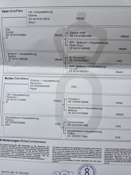 For sale is a very beautiful colt in dark color. Excalibur combines the coveted F blood through his mother "Rising Sun," from the Rudilore line, and the best E blood through his father "Etienne." Excalibur was presented at the foal show on June 27th and received the Oldenburg premium with a very good rating. He was born with us and lovingly raised and educated according to his age. Now he is soon ready to embark on a new path in life.