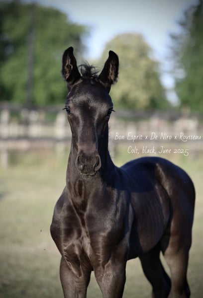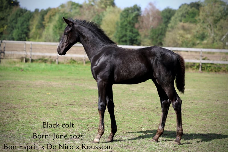 Outstanding elegant black beauty with a great future ahead! ~Bon Esprit x De Niro x Rousseau~ This stunning black colt from an excellent bloodline has three very good basic gaits, with an exceptionally good walk. He is uphill and moves with a lot of self-carriage. This lovingly raised foal, born in June 2025, is now ready for his new 5⭐️ home where he will have the chance to develop into a great stallion and/or sport horse. A colt with excellent developed, size and presence. He is expected to reach around 1.75m mature height (height at 1 day old 1.14m and at 5 months old 1.46m). Well-handled and accustomed to all daily routines. He is bred by the Oldenburger champion Bon Esprit out of a KWPN “Prok, Ster, Voorlopig Keur” mare by De Niro with a height of 1.73m. His 2nd dam is a KWPN “Preferent, Prok, Ster, Voorlopig Keur” mare by Rousseau with a height of 1.72m. The halfbrother of this special colt (by For Ferrero) is a KWPN selected stallion (height 1.75m) who is currently in training to make his debut at a higher lever of competition. His halfsister (by For Ferrero) is a KWPN Prok, D-OC, Elite mare (height 1.69m) who completed an excellent IBOP test with a score of 80.5 points. His 2nd dam gave the KWPN selected and Grand Prix dressage horse Empire (by Tuschinski). His 3rd dam gave the Grand Prix dressage horse Unsiga (by Gribaldi) and the Inter I level dressage horse SJL Duuk (by Vivaldi). His damline also include the Grand Prix showjumping horse U Mijnheer (by Triomphe de Muze) and the promising dressage stallion Solid Rock (by McLaren), KWPN selected in 2025. More images and videos are available upon request for those seriously interested.