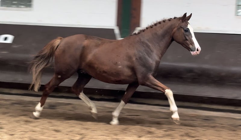 Mooie, kleurrijke, 4x hoog witte, dubbel geplaatste merrie, drachtig voor 2025 van de al even kleurrijke dubbelvererver, kampioenshengst en HLP winnaar Cafe au lait, die al enkele jaren de aandacht trekt met zijn ongelooflijk succesvolle nakomelingen in de dressuur- en springsport op gevorderd niveau. Ze verwacht volgend jaar ook een veulen via embryotransplantatie van de onlangs goedgekeurde Cafe au lait nakomeling "Cafe's Don Rubin"! Beide hengsten zijn homozygoot donker, er kan geen vosje vallen. De jongere volle broer van de merrie is al succesvol op medium dressuurniveau en andere broers en zussen van dezelfde moeder zijn succesvol op gevorderd dressuurniveau. Ze was zelf reservekampioen op de veulenkampioenschappen en is extreem sterk in beweging! Staat in hengstenmodel, met veel hals en een vlekkeloze bovenlijn! Cafe au lait kan schitteren met een aantal dubbel getalenteerde nakomelingen: Cafe's "Casimir" (Cafe au lait x Calido x Grannus) was de gevierde hoofdprijswinnaar op de Oldenburg Elite Auction, was op jonge leeftijd al seriewinnaar bij de medium (M) dressuurpaarden en was als 7-jarige opnieuw seriewinnaar bij zijn eerste dressuurwedstrijden op gevorderd (S) niveau! Hij zegeviert nu in internationale Intermediaire I klassen. Kasselmann's merrie Cafe's Caletta (Cafe au lait x Calato) heeft ook al dressuurwedstrijden op gevorderd (S) niveau en internationale Grand Prix gewonnen. Cafe's Matts (Cafe au lait x Don Frederico) was het op één na duurste dressuurpaard op de Oldenburger Summer Mixed Sales. Andere jonge paarden uit springgeörienteerde fokmerries hebben zich al meerdere keren geplaatst in proeven voor jonge dressuurpaarden op gevorderd (A) tot middelbaar (M) niveau en zijn opvallend sterk bewegend en helder van geest. Het lijdt geen twijfel dat de Cafe au lait nakomelingen overtuigen in de springsport tot op gevorderd niveau. De gekeurde Cafe's Champus was Vice Wereldkampioen jonge paarden onder Rene Tebbel en staat ook bij ons ter dekking. Ook gekeurd en uit ons fokprogramma: Cafe Junior (Cafe au lait x Silvio I), internationaal geplaatst in springwedstrijden op gevorderd (S*) niveau, Cafe's Columbo (Cafe au lait x Belstaff), succesvol in Frankrijk. Cafe au lait zelf was finalist in het Bundeschampionat onder Philipp Weishaupt en is succesvol geweest tot en met gevorderd (S***) niveau in de springsport, maar heeft ook drie spectaculaire gangen en is opgeleid tot en met gevorderd (S) niveau in de dressuursport. Hij is gestationeerd bij Paul Schockemöhle en heeft al een aantal internationaal succesvolle springpaarden gebracht, waaronder "Royce", die de FEI CSI5* $500,000 Rolex Grand Prix Wellington won. Onze veulens krijgen dagelijks mineraalvoer en veulenstarter, regelmatig EQUISTRO Haemolytan en Ipaligo Foal, ontwormen en een hoefsmid zijn ook vanzelfsprekend. De moederdieren krijgen ook speciaal merrievoer tijdens de dracht, dagelijks sapvoer en lijnzaadolie, en hooi ad libitum. Dit zorgt ervoor dat onze nakomelingen altijd in optimale gezondheid verkeren! Meer veulens en nakomelingen uit ons eigen fokprogramma op aanvraag. Sommige zijn te vinden onder de andere advertenties. Elk jaar hebben we ongeveer 20 veulens van Cafe au lait en Cafe's Don Rubin. Video aanvragen etc. vooraf alleen mogelijk via Whats App.