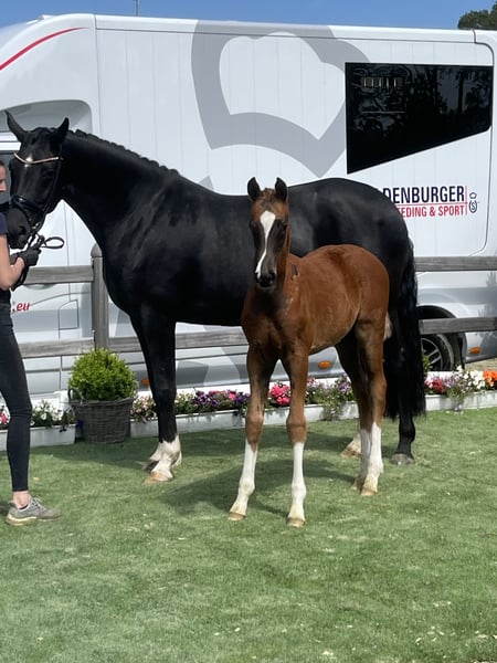 Love Romance… a tall, stunning mare from the Oldenburg damline of Love Story. She successfully completed her performance test in Vechta and was awarded the Verband Premium status. Love has produced premium and auction foals. She has an exceptionally refined and lovable character, is very well-handled, and gets along well within the mare group. We could also easily see her as a family and riding horse. For the 2026 breeding season, Love is not in foal. We are looking to place her in a beautiful and caring home. For more information, please contact 01749049299.