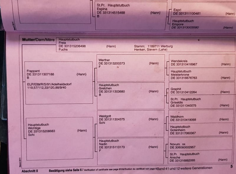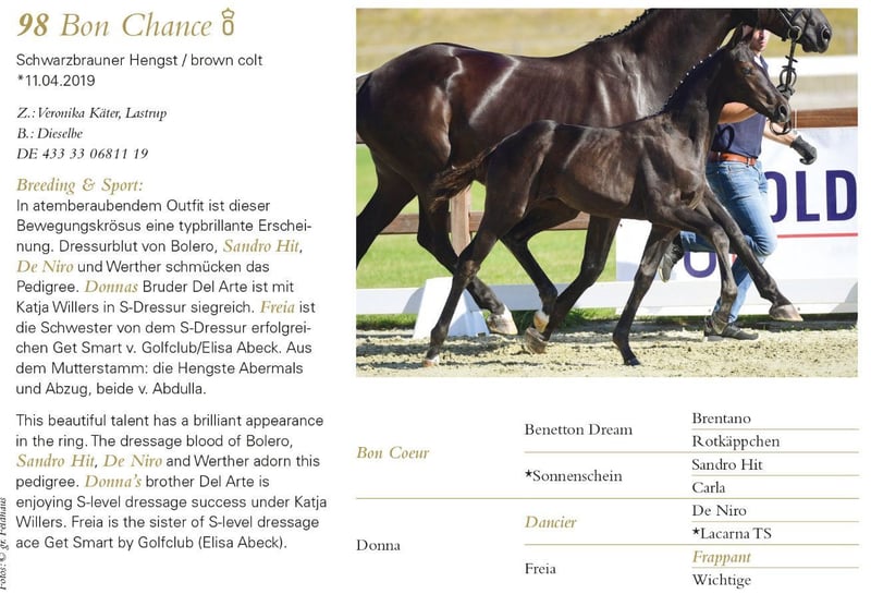 Embarazada para marzo por el excepcional semental Secret de Sezuan. Una yegua con la que también se puede cruzar sin problema con jóvenes sementales modernos. Aporta tamaño, base sólida, corrección y una personalidad sensacional. También transmite un paso muy bueno, una actitud motivada y tranquila, y en general es muy fácil de manejar. Sus crías se encuentran en la disciplina de doma, al igual que sus medio hermanos. Línea de sangre de doma de Graphit. Werther, Lauries Crusador xx y De Niro adornan su pedigrí. El hermano de Donna, Del Arte, ha sido triunfador en la categoría S en la disciplina de doma bajo Katja Willers. La madre de Donna, Freia, es hermana del exitoso en S en doma Get Smart, de Golfclub/Elisa Abeck. De la línea materna también provienen los sementales Abermals y Abzug, ambos de Abdulla. Ya ha dado a luz candidatos para subastas y potros de élite. Donna sufre ligeramente de artrosis en la parte trasera, pero esto no le limita en absoluto. También ha sido montada. Con nosotros siempre estuvo en paddock con otras yeguas, lo cual es lo mejor para ella. Para el parto, por supuesto, será alojada en el establo. Tel.: 017632574900