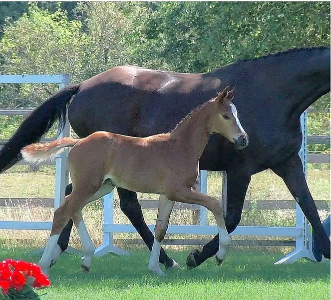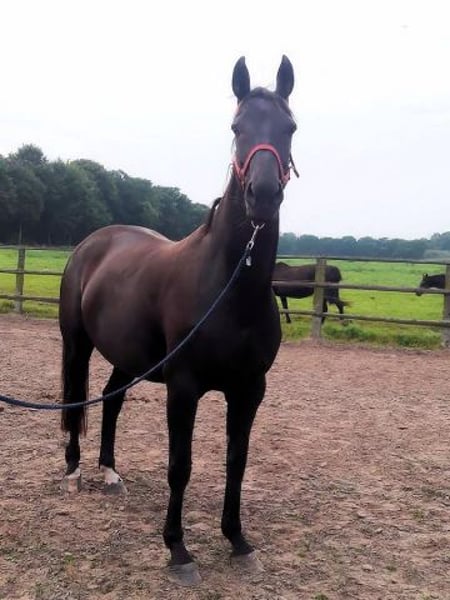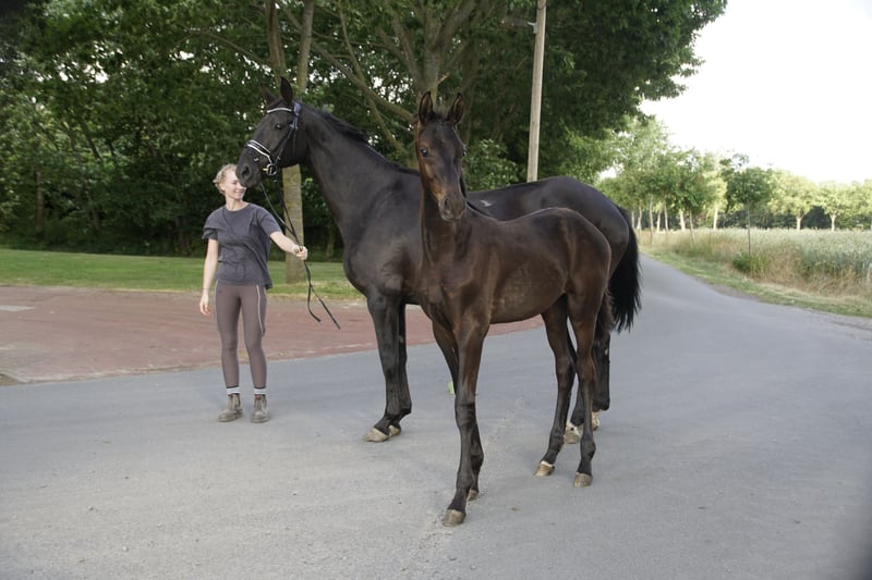 Pregnant for March by the exceptional stallion Secret from Sezuan. A mare that can be confidently paired with modern young stallions. She brings size, a solid foundation, correctness, and an outstanding character. She also passes on an excellent walk, a performance-oriented and mentally clear attitude, and is simply straightforward in all aspects. Her offspring can be found in dressage, as well as her half-siblings. Dressage bloodlines from Graphit, Werther, Lauries Crusador xx, and De Niro adorn her pedigree. Donna’s brother, Del Arte, has achieved success in S-level dressage with Katja Willers. Donna’s dam, Freia, is a sister to the S-level dressage winner Get Smart by Golfclub/Elisa Abeck. The maternal line also includes stallions Abermals and Abzug, both by Abdulla. She has already produced auction candidates and elite foals. Donna suffers slightly from arthritis in the hind legs, but this in no way limits her. She has also been ridden. She has always been kept in an open stable with other mares, which is best for her. Of course, she will go to the foaling stall when the time comes. Phone: 017632574900