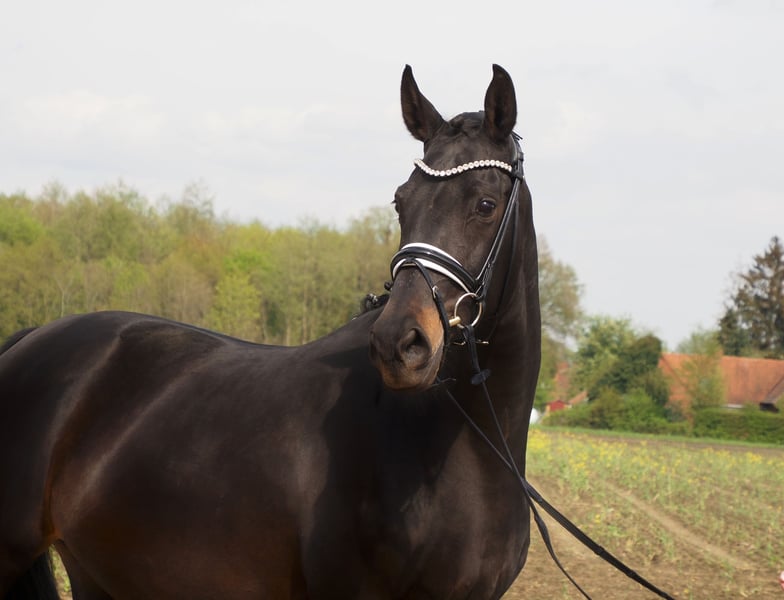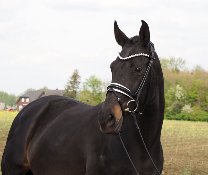 This chic lacquer black and dynamic mare already brought a successful offspring of Sir Donnerhall, who is now 8 years old already victorious in S-dressage! She is pregnant for May 2023 from the Schockemöhle sire "Expectation", whose first foal year is eagerly awaited this year! The mare has been ridden before breeding and can do it again after foaling.