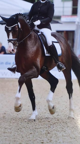 Ta elegancka lakierowana czarna i dynamiczna klacz przyniosła już udane potomstwo Sir Donnerhalla, który ma teraz 8 lat, już zwyciężył w S-ujeżdżeniu! Jest w ciąży do maja 2023 r. z ojcem Schockemöhle "Expectation", którego pierwszy rok źrebięcia jest w tym roku niecierpliwie oczekiwany! Klacz była dosiadana przed hodowlą i może to zrobić ponownie po źrebięciu.