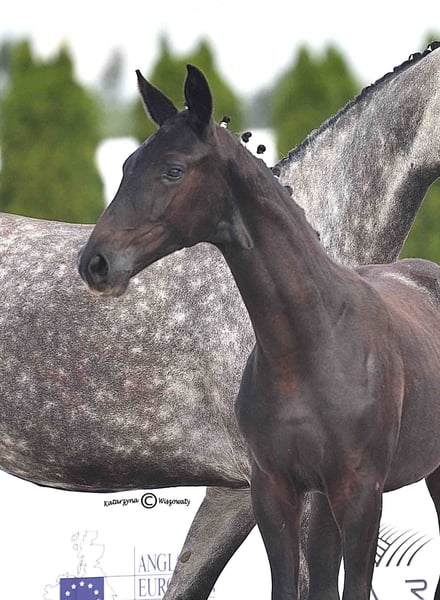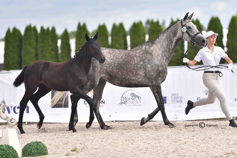 Sehr edle, auffällige Stute, die nicht nur durch ihren Typ, sondern auch durch ihre korrekte Anatomie und vor allem durch ihre leichte, elastische Bewegung besticht. My Lady Adventure erzielte hohe Bewertungen beim VI. Offenen Fohlen- und Hengstchampionat der Edlen Rassen in Radzionków. Die Richter lobten ihren modernen, sportlichen Typ, ihre Erscheinung sowie vor allem ihren Trab und Galopp. Dieser Erfolg überrascht nicht, wenn man ihr reichhaltiges Pedigree mit wertvollen Genen betrachtet. Ihre Vorfahren glänzten nicht nur auf Turnierplätzen, sondern auch in internationalen Springhallen. Ihr Vater ist der Oldenburger ESCANTO PS – Deutscher Meister der 4-jährigen Reitpferde, zweifacher Champion des Hengsttests und Gewinner der Hauptprämie beim Körungsturnier. Er trägt die Gene des herausragenden Vererbers Escamillo, dem er sehr ähnlich ist, und gibt diese Eigenschaften stark an seine Nachkommen weiter – eine wunderschöne, harmonische Konformation und nahezu perfekte Proportionen für den Dressurviereck. Escanto ist ein wahrer Athlet mit expressiver Kraft und Tüchtigkeit, beständigem Rhythmus in den Gangarten sowie natürlicher Fähigkeit zur Selbsthaltung. Ebenso wertvoll ist die weibliche Seite ihres Pedigrees. Ihre vierte Mutter, Gardenia, startete im Springen bis zur Klasse CC1 und nahm an den polnischen Meisterschaften der Senioren teil. Sie ist Halbschwester zu Springpferden wie Garnizon (anerkanntes Hengst, bis 140 cm), Gandia, die erfolgreich bis 145 cm sprang, sowie einem weiteren lizenzierten Hengst, Grom, der eine Karriere im Springen bis 130 cm vorweisen kann. My Lady Adventure stammt aus einer wertvollen Familie der Stute Georgia uszl.x (nach Bezimienny brdbg), die vor allem in der Zuchtstation Moszna, später auch in SK Prudnik, aufgewachsen ist. Viele ihrer Nachkommen haben auf Springturnieren Erfolge erzielt, darunter Gino (Klasse CC3), Gitta (MPMK-B), Grog (130 cm), Goldmara (145 cm), Goster (130 cm), Gardes G (140 cm), Gig (150 cm), Gayall (135 cm). Nicht zu vergessen ist das phänomenale, epochale Rennpferd Galerius (nach Jape xx), das 39 Rennen bestritt, 30 davon gewann (!), zweimal Zweiter und zweimal Dritter wurde. Insgesamt erzielte es Preisgelder in Höhe von 120.356 zł. In dieser Familie wurden auch Vielseitigkeitspferde wie Gio Candio, Sieger der MPMK-C bei den 4-Jährigen, Green Light M, Garda (CCI*) und Graal (nach CNC*) gezogen, ebenso zahlreiche lizensierte Hengste: Grog, Gig, Gastin, Gorset, Gregory, Gayall, Grom und Gladiolus M. Der Hengst der Mutter ist der silbergraue Hickstetstakkato, ein Sohn des bekannten Hengstes Hickstead White, eines 155 cm großen Pferdes, das u.a. die Große Runde in Wiener Neustadt/AUT, Lichtenvoorde/NED sowie das Grand Prix (150 cm) in Linz-Ebelsberg/AUT gewann. Die Stute ist sehr freundlich, geht gerne auf Menschen zu. Sie ist an das Handling gewöhnt: Beine heben, Putzen, Satteln, Trense anlegen und Longieren. Sie ist mit dem Schmied vertraut. Im Sommer steht sie in einem Freilaufstall mit Unterstand, kann aber auch problemlos im Stall gehalten werden. Sie ist bereits entwöhnt und bereit zur Abholung. Link zum Video auf Instagram https://www.instagram.com/reel/DObWkqVjOtw/?igsh=MW1qOXlqa3VyanYxbg== Zweites Video https://www.instagram.com/reel/DOmJROPDPQ5/?igsh=aDB5cjRzdHM1OG42 Video und Bewertung zur Oldenburger Prämierung https://www.instagram.com/reel/DOmKk_sDCVe/?igsh=dGpsZzZkOXg0OGNx
