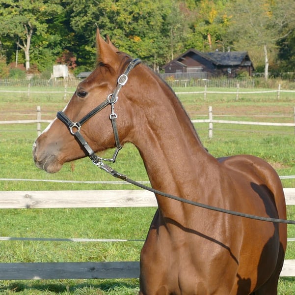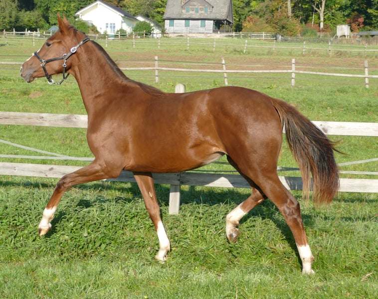 herrliche große Dunkelfuchsstute mit bestem Exterieur und Fundament, 4x hoch weiß mit schöner regelmäßiger Blesse, sehr umgänglich und gut erzogen, bestens aufgezogen und sehr gut entwickelt. Mit Sezuan, Sezuans Donnerhall, Dante Weltino, Danone, De Niro international hocherfolgreiche GP Leistungsträger im Pedigree. Hier wächst ein ganz besonderer Edelstein heran. Oldenburger Elektia Stamm.