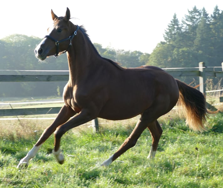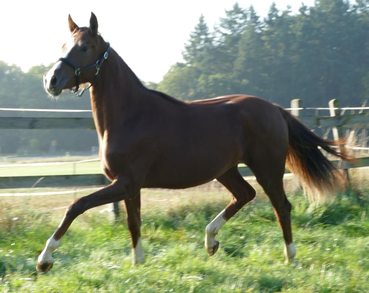 Magnifique jument alezane foncée de grande taille avec une excellente conformation et un bon fondement, 4x hautement blanc avec une belle étoile régulière, très sociable et bien éduquée, élevée avec soin et très bien développée. Avec Sezuan, Sezuans Donnerhall, Dante Weltino, Danone, De Niro, des performers de GP internationalement reconnus dans le pedigree. Ici, un véritable joyau est en train de se développer. Lignée Oldenburger Elektia.