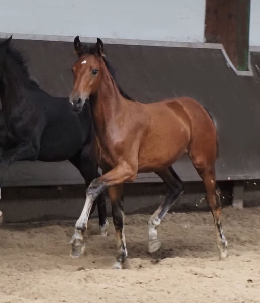 This typey filly convinces with its quality and the extremely interesting blood flow for dressage and show jumping alike! She is one of the most active foals of her year! Father "Cafe au lait", licensing winner, HLP winner and BuCha finalist, has made a name for himself in recent years through his extremely successful offspring in dressage and show jumping in the heavy class alike. This is how Cafe's Casimir" (Cafe au lait x Calido x Grannus) became the celebrated top prize of the Oldenburg Elite Auction, is already a serial winner in S-dressage and international Intermediaire I victorious at a young age. Mare Kasselmann's Cafe's Caletta (Cafe au lait x Calato) has also already placed S-dressage and won the International Grand Prix. Cafe's Mats (Cafe au lait x Don Frederico) became the second most expensive dressage horse of the Oldenburg Summer Mixed Sales. Other young horses from jumping dam mares have already placed several times in dressage horse tests A to M and are remarkably strong in movement and clear as head. There is no question that the café au lait offspring are convincing in show jumping up to the advanced class (e.g. from our breeding Cafe's Champus: licensed, Vice World Champion of young horses, Cafe Junior: licensed, internationally successful in Saudi Arabia). Stationed with Paul Schockemöhle, Cafe au lait has already produced several internationally successful show jumpers, including "Royce", winner of the FEI CSI5* $500,000 Rolex Grand Prix Wellington. Cafe au lait himself was a national championship finalist under Philipp Weishaupt and has been successful up to S*** jumping, but has also been equipped with three convincing GGA and has been trained dressage at S level. Our foals receive daily mineral feed and foal starters, regular EQUISTRO Haemolytan and Ipaligo Foal, worming and blacksmithing are of course also a matter of course. The mothers also receive special mare feed throughout the pregnancy, daily juice feed and linseed oil, as well as hay ad libitum. So our offspring are always in the best state of health! There are also some pregnant broodmares for sale, some of which can be found under the other advertisements. If the pedigree is suitable, trade-in of broodmares is possible. The equally high-quality chic full sister has already been sold, the full brother is in the process of being licensed and can also be viewed on site. Video requests are only possible via WhatsApp. She is already discontinued and can move daily.