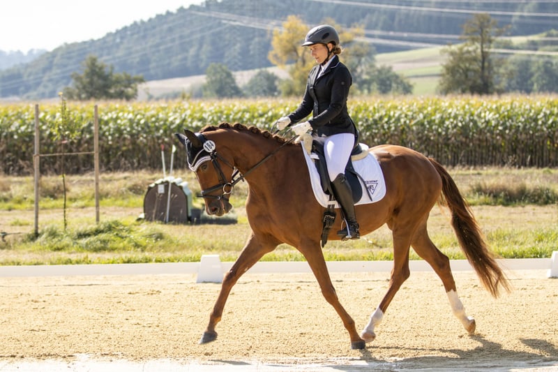 ⚜️ OLHPr. Reconquista GG ⚜️ is a mare born in April 2020, sired by Blue Horse Baron x Degas x Romancier. With a height of approximately 1.68 m, she combines size, expression, and elegance. She impresses daily with her friendly, performance-oriented, and well-mannered nature! 😊 A sporty partner, her balanced character makes her ideal for amateurs as well. She has been gently backed and is absolutely uncomplicated in daily handling, always proving to be reliable and pleasant. She has already made a name for herself in competition: In her very first riding horse test in Schwandorf Büchlkühn, she placed third, receiving a score of 8.0 for walk, canter, and conformation. Currently, she is being trained at the Dressage Horse L level - additionally, she is successfully placed in Dressage Horse A competitions, confirming her talent for the future. She comes directly from the breeder and has not had any negative experiences. She is farrier-friendly and loading-friendly, and is regularly dewormed and vaccinated. A ride out in the countryside is a welcome change and an integral part of her current training, posing no challenge for her. Last year, she successfully completed the mare performance test as a main premium candidate at the Oldenburg Horse Breeding Association, making her highly interesting for breeding as well. (Breeding book excerpt available under documents) Good X-rays from December 2024 are available. Reconquista is a promising partner for anyone looking for talent, character, and perspective. To spare her from riding tourism, a fee of €35 is charged for trial rides. I am happy to answer any further questions by phone.
