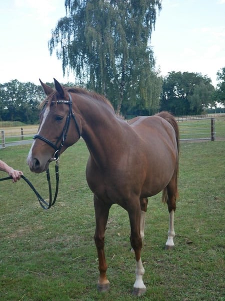 Oldenburg main premium mare from April 2019. As a three-year-old, she completed the mare performance test with a final score of 7.80. The external rider awarded her a rideability score of 8.5. She participated in the elite mare show in Rastede 2022 and was subsequently placed second in a riding horse test before going into breeding. Feldsternchen is guaranteed in foal to Barbarossa, last covering date April 26, 2025. Barbarossa stands at the State Stud Celle and is sired by Bonds out of For Romance out of De Niro. He completed his sport test with a score of 8.44. Performance-oriented bred from the Oldenburg mare line of Feldgoldline and direct maternal line of Laudate Dominum, Cesare Dandini, Skyla, and many more.