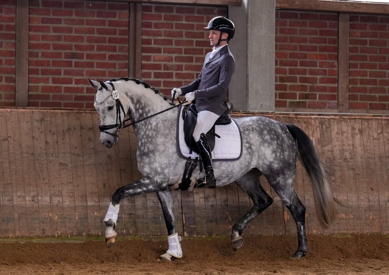 Eine wunderschöne 7-jährige Grauschimmelstute steht zum Verkauf. Sanjana stammt von dem sehr erfolgreichen Hengst Baron ab. Die Kreuzung mit der Springlinie von Democraat verleiht ihr viel Go und Stabilität im Fundament. Sie ist eine zuverlässige Partnerin als Sport oder Freizeitpferd. Bereits im Alter von 5 Jahren wurde sie in der dpfA auf Anhieb platziert und ist nun mit 7 Jahren auf dem Weg in die M-Klasse. Sie bringt immer Freude an der Arbeit mit und ist ein Pferd, das gerne arbeitet. Geeignet ist sie für ambitionierte Amateure oder für Profis, die sie weiter bis in die hohe Klasse ausbilden möchten, da ihre Versammlungsfähigkeit enorm ist. Sie besticht durch ein wunderschönes graues Fell und einen sehr eleganten Kopf mit sportlichem Körperbau bei einer Größe von 165 cm. Sie ist sehr umgänglich beim Satteln, Scheren, putzen und Transport. Sehr sauber in der Box und unkompliziert beim Fressen, ohne schlechte Stallgewohnheiten. Sie verfügt über ein Tüv inkl Rücken und Hals, welcher 2024 Bei Interesse gerne telefonisch oder per WhatsApp unter 0170 28 46 173 melden.