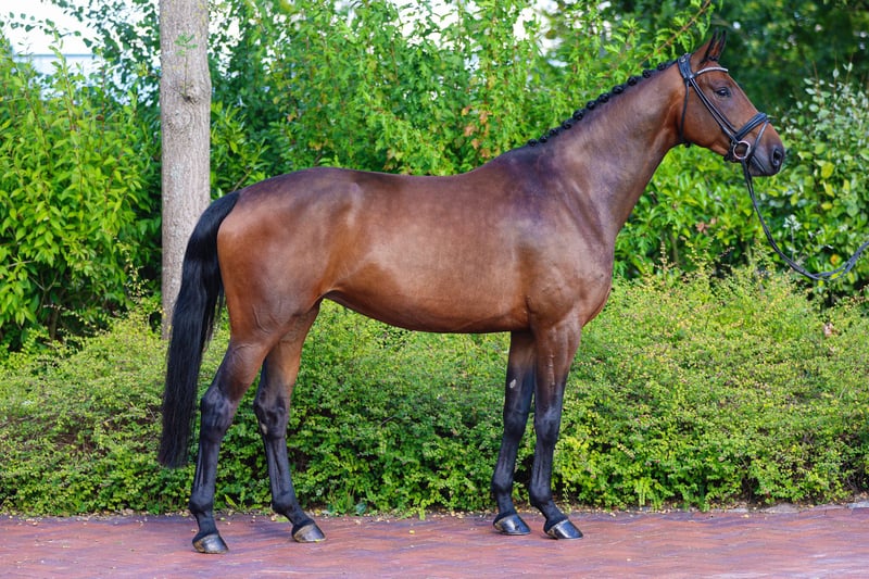 This stunning mare is currently in foal to Federer, who at just seven years old has already won two S-level dressage tests. The expected foaling date is early May. The foal from the same damline (photo) from last year was secured by clients from America. This damline has produced premium stallions such as Fürstbischof and, most recently, Dynamic Plaisir. Additionally, the licensed stallion Bueno SL in Denmark, as well as the Grand Prix horses Sultan des Paluds FRH and Friedolin, also originate from this maternal line.