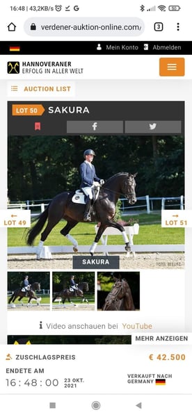 Kucyk-suka z aukcji od Extreme US × San Amour × Sandro × Caretano Z Rekomendowana przez związek Oldenburski Nasza klaczka-suka nie mogła się w pełni zaprezentować podczas aukcji elitarnej źrebiąt w Vechcie 3 października 2025 roku ze względu na chwilową formę i nie została sprzedana za naszą minimalną cenę. Dlatego oferujemy ją teraz w bezpośredniej sprzedaży. Urodzona: 2 czerwca 2025 r. Kolor: kare WFFS-free To wysokiej jakości źrebięta zachwyca aktywną tylną kończyną i naturalnym nachyleniem do góry. W stępie wyróżnia się rytmiczną mechaniką, dużą swobodą w obrębie łopatki, a galop jest szeroki, z dużym wykrokiem i nachyleniem do góry. Szczególnie godny uwagi jest chód z wyraźnym przestrzennym rozkładem nóg. Linia matczyna przekazuje nieprzerwanie doskonałe zdolności skokowe, co czyni tę parę zarówno interesującą dla nowoczesnej dyscypliny ujeżdżenia, jak i przyszłości hodowlanej. Na co dzień źrebię jest czujne, przyjazne i łatwe w obsłudze. Podstawowe ćwiczenia z zakresu obsługi młodych koni (halter, podawanie kopyt, prowadzenie) są opanowane na odpowiednim poziomie i pewne. Terminy czyszczenia kopyt i odrobaczania odbywają się regularnie. Matka klaczy wielokrotnie udowodniła swoją wysoką jakość dziedziczenia. Ponieważ posiadamy już kolejne potomstwo z tej linii, przekazujemy to obiecujące źrebię w dobre ręce. Rodowód: Ojciec: Extreme US (Escamillo × Vivaldi) - Dwukrotny zwycięzca Pavo-Cup (2023, czteroletni z oceną 10 pod Danielem Bachmannem Andersenem oraz 2025, sześcioletni) - Ogólny zwycięzca serii turniejów ogierów KWPN 2023/24 - Zwycięzca testu wytrzymałościowego ogierów KWPN z wynikiem 89 punktów Linia matczyna: San Amour × Sandro × Caretano Z - Prawie wszystkie dotychczasowe potomstwo nagrodzone lub z tytułami elity - Przekazuje typ, rittigkeit oraz solidne zdolności skokowe Sukcesy półbraci: Monday 28 (v. Morricone) - Zwycięzca konkursu ujeżdżeniowego (stęp, kłus, galop po 8,5) - W posiadaniu Thomasa Müllera, prezentowany przez Waltera Wadenspannera - Sprzedany na aukcji elitarnej źrebiąt w Vechcie Sakura (v. Sezuan) - Rejestracja w głównym księdze Hannoveru, ogólna ocena 8,0 (zdolności skokowe 8, stęp 8, galop 8, kłus 7,5) - Kandydatka do tytułu premii, 1b-prämie na pokazie Herwart-von-der-Decken 2020 - Nagroda 1a na wystawie hodowlanej stowarzyszenia - Zwyciężczyni konkursu ujeżdżeniowego dla koni sportowych - Sprzedana na aukcjach elitarnych w Verdenie Matka – pełna rodzina 16 (Aktinie xx) Jedna z najbardziej sprawdzonych linii czystej krwi w Niemczech, odnosząca sukcesy w hodowli koni ujeżdżeniowych i skokowych. Wyhodowana m.in. przez: - Sybelius – sukcesy międzynarodowe do poziomu S w ujeżdżeniu - Camilie Z (v. Caretano Z) – międzynarodowe skoki do 1,60 m z Athiną Onassis - Amerigo Vespucci xx – wpływowy w hodowli koni hanowerskich - Feuerfunke xx i Feuertänzer xx – ujeżdżenie i wszechstronność - Fürst Nymphenburg I i II (Florencio I × De Niro × Argentinus) – sportowe i hodowlane osiągnięcia Na filmie z pastwiska widać matkę z wcześniejszym źrebięciem. Dodatkowe filmy i zdjęcia Sakura dostępne są na życzenie. Możliwość odchowania pod opieką u nas po wcześniejszym uzgodnieniu.