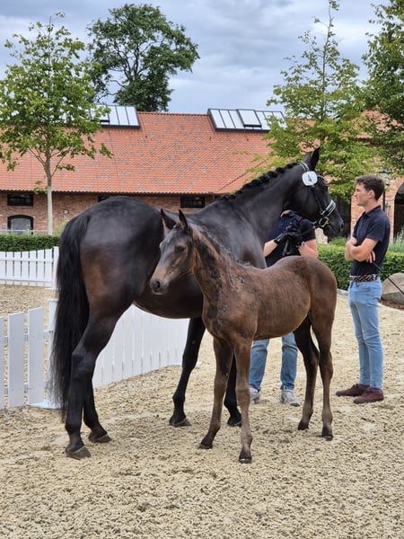 Zum Verkauf steht eine vielversprechende Oldenburger Stute, geboren am 20. April 2025. Diese elegante Rappstute besticht durch ihre ansprechende Ausstrahlung und ihr Bewegungstalent, ideal für den Dressursport. Man könnte sie sich aber auch gut im gehobenen vielseitigkeiten Freizeitbereich vorstellen. Am 05. Juli 2025 wurde sie bei der Fohlenschau auf Gut Schönweide mit folgendem Kommentar als Oldenburger Prämienfohlen ausgezeichnet. "Ein Fohlen mit sehr viel Dynamik und auffallende Kniemechanik, auch aktiv im Hinterbein... Ein sehr gelungenes Fohlen mit einem sympatischen Gesicht, ganz harmonisch konstruiert und korrekt im Fundament." Dieses Stutfohlen stammt ab von Escaneno, ein Prämienhengst, der für seine außergewöhnlichen Reitpferdequalitäten bekannt ist und dieses Jahr, 6-jährig, bei der Weltmeisterschaft der jungen Dressurpferde platziert wurde. Sie ist brav im Umgang, gut sozialisiert und hat ein freundliches Wesen. Dabei ist sie immer offen dem Menschen gegenüber und sucht den Kontakt zu einem. Bei Interesse oder für weitere Informationen stehe ich Ihnen gerne zur Verfügung. Besuchen Sie uns und überzeugen Sie sich selbst von diesem tollen Fohlen.