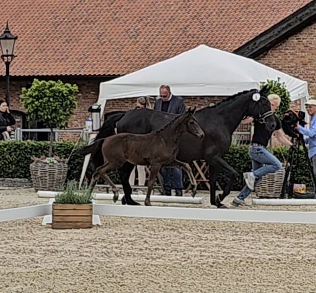 Te koop is een veelbelovende Oldenburger merrie, geboren op 20 april 2025. Deze elegante zwarte merrie valt op door haar aantrekkelijke uitstraling en haar bewegingsvermogen, ideaal voor de dressuursport. Je zou haar ook goed kunnen voorstellen in de hogere veelzijdige vrijetijdssector. Op 5 juli 2025 werd ze op de veulenkeuring op Gut Schönweide onderscheiden als Oldenburger premieveulen met de volgende opmerking: "Een veulen met veel dynamiek en opvallende knie-mechaniek, ook actief in het achterbeen... Een zeer geslaagd veulen met een sympathiek gezicht, helemaal harmonieus gebouwd en correct in het fundament." Dit merrieveulen is afstammend van Escaneno, een premiehengst die bekend staat om zijn uitzonderlijke rijpaardkwaliteiten en dit jaar, 6 jaar oud, geplaatst werd op het Wereldkampioenschap voor jonge dressuurpaarden. Ze is braaf in de omgang, goed gesocialiseerd en heeft een vriendelijk karakter. Ze staat altijd open voor mensen en zoekt contact. Bij interesse of voor meer informatie sta ik tot uw beschikking. Bezoek ons en overtuig uzelf van dit geweldige veulen.