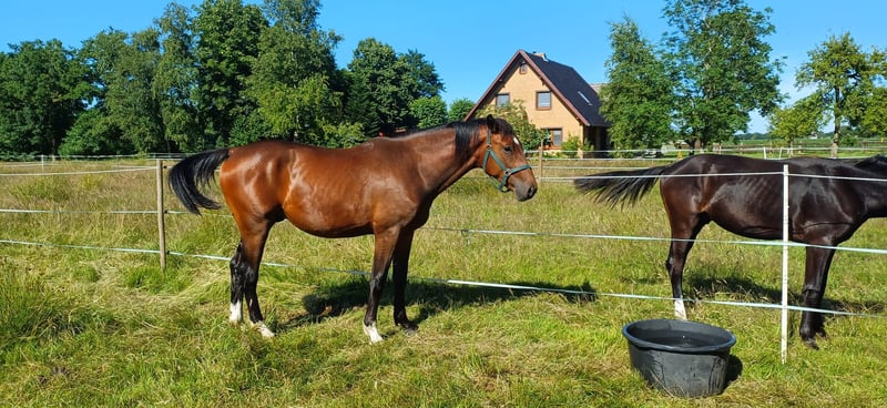 Hello, I am offering my 2.5-year-old gelding for sale, whom I bred myself. He has a striking presence and is very attentive to humans. This large-framed gelding remains remarkably calm in any situation. X-ray images of his legs are available, and he has been regularly vaccinated and dewormed. He possesses three very good gaits, with the walk and canter being particularly notable. Due to his calm and balanced nature, he will make an excellent partner for sport and leisure activities. His dam was placed in dressage horse classes A to M and has been trained up to M level. His half-brother also has several placements in dressage horse class A. She descends from Foundation and has very successful half-siblings (state premium mares), with their progeny also performing well. Additionally, she has a licensed half-brother. His sire, Faszination de Malleret, was once a Hanoverian premium stallion. He is a wonderful horse with promising future potential. Please feel free to contact me if interested.