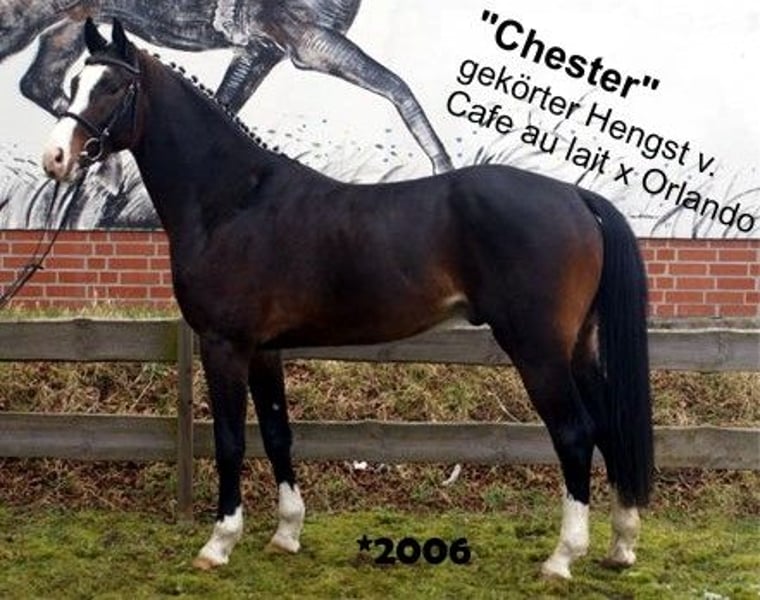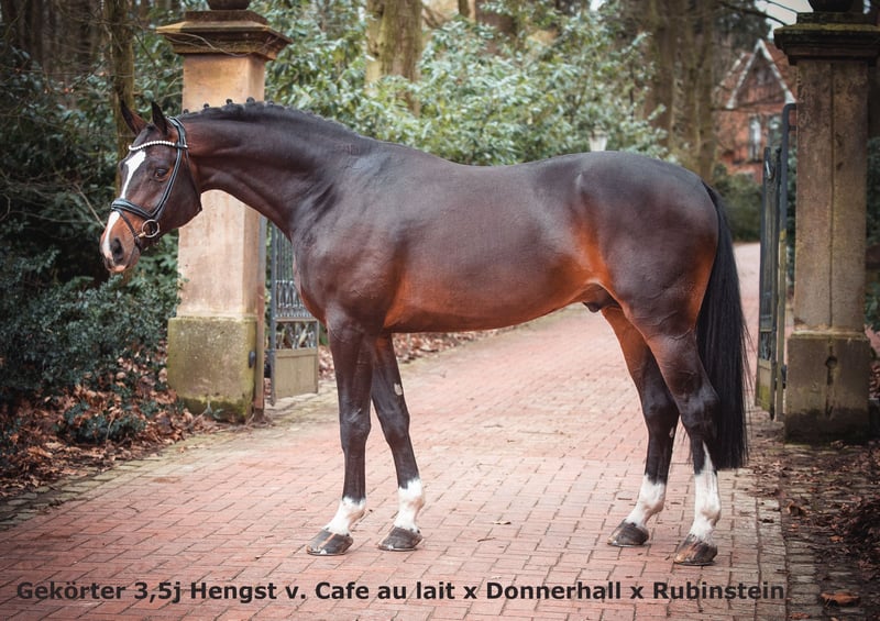 It doesn't get any better than this! Chocolate brown stallion candidate as painted! 4x white with blaze, he already attracts everyone's attention with his appearance. Here a very special, double-predisposed young horse matures. His dam (Bretton Woods x Zeus) has even been placed several times in young horse competitions, jumping and cross-country and is extraordinarily strong in movement. Descended from our licensing winner and HLP winner "Cafe au lait", who has been attracting attention for quite some time with his incredibly successful offspring in dressage and show jumping (can also be visited on site). One of the few sires, who can boast several successful offspring in both disciplines up to the advanced class! This is how Cafe's Casimir" (Cafe au lait x Calido x Grannus) became the celebrated top prize of the Oldenburg Elite Auction, is already a serial winner in dressage horses M at a young age, and at the age of 7 he is again a serial winner in his first S dressage! Meanwhile, he is victorious in international Intermediaire I. Mare Kasselmanns Cafe's Caletta (Cafe au lait x Calato) is already S** dressage and international Grand Prix victorious. Cafe's Matts (Cafe au lait x Don Frederico) became the second most expensive dressage horse of the Oldenburg Summer Mixed Sales. Other young horses from jumping dam mares have already placed several times in dressage horse tests A to M and are remarkably strong in movement and clear as head. There is no question that the café au lait is convincing offspring in show jumping up to the advanced class. Thus, the licensed Cafe's Champus under Rene Tebbel became Vice World Champion of Young Horses. Also licensed and from our breeding: Cafe Junior (Cafe au lait x Silvio I), placed internationally S*-jumping. Cafe au lait himself was a finalist in the National Championships under Philipp Weishaupt and has been successful up to S*** jumping, but has also been equipped with three spectacular GGA and has been trained dressage at S level. Stationed with Paul Schockemöhle, he has already fathered several internationally successful show jumpers, including "Royce" (Cafe au lait x Grandilot), victorious in the FEI CSI5* $500,000 Rolex Grand Prix Wellington. Our foals receive daily mineral feed and foal starters, regular EQUISTRO Haemolytan and Ipaligo Foal, worming and blacksmithing are of course also a matter of course. The mothers also receive special mare feed, juice feed, linseed oil and hay ad libitum throughout the pregnancy. So our broodmares and their offspring are always well cared for and in top condition! Other foals and young horses from our own breeding on request. Some of them can be found among the other ads. We have around 20 café au lait foals every year. There are also always some pregnant broodmares for sale. (Video) Inquiries can only be made via WhatsApp.