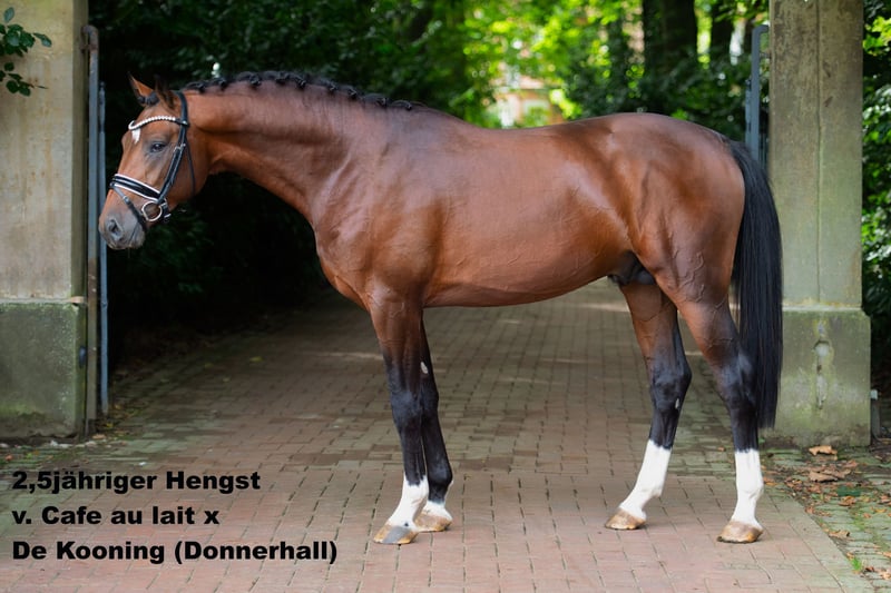Schöner geht es nicht! Dunkelschokoladenbrauner, enorm bewegungsstarker und sprunggewaltiger Cafe au lait Nachkomme wie gemalt! 4x weiß mit Blesse, zieht er schon jetzt durch seine Erscheinung alle Blicke auf sich. Hier reift ein ganz besonderes, doppelveranlagtes Nachwuchspferd heran. Seine Mutter (Bretton Woods x Zeus) ist selbst in Jungpferdeprüfungen Springen u. Gelände mehrfach platziert gewesen und außerordentlich bewegungsstark. Früh geboren (im Januar bereits 3jährig) ist er jetzt schon außerordentlich weit entwickelt und wird dementsprechend zukünftig in Jungpferdeprüfungen immer im Vorteil sein. Derzeit wird er longiert und langsam angeritten. Der Vater Cafe au lait, Siegerhengst seiner Körung, HLP Sieger und BuCha Finalist, war selbst siegreich in der schweren Klassen und hat sich in den letzten Jahren einen Namen als Doppelvererber mit Spitzennachzucht gemacht. So wurde Cafe's Casimir" (Cafe au lait x Calido x Grannus) gefeierte Preisspitze der Oldenburger Eliteauktion, ist bereits in jungen Jahren Seriensieger in S- Dressuren und international Intermediaire I siegreich. Stute Kasselmanns Cafe's Caletta (Cafe au lait x Calato) ist ebenfalls bereits S-Dressur platziert und international Grand Prix siegreich. Cafe's Matts (Cafe au lait x Don Frederico) wurde zweitteuerstes Dressurpferd der Oldenburger Summer Mixed Sales. Weitere Jungpferde aus springbetonten Mutterstuten sind bereits mehrfach in Dressurpferdeprüfungen A bis M platziert und sind bemerkenswert bewegungsstark und kopfklar. Dass die Cafe au lait Nachkommen im Springsport bis zur schweren Klasse überzeugen steht außer Frage, so zum Beispiel aus unserer Zucht: Cafe's Champus: gekört, Vizeweltmeister der jungen Pferde Cafe Junior: gekört, international erfolgreich in Saudi Arabien Cafe's Columbo: gekört und sporterfolgreich in Frankreich Cafe's Don Rubin: gekört, 4jährig als jüngstes Pferd Bronze beim Dobrocker Deisterchampionat, aktuell qualifiziert zum Bundeschampionat in seiner 2. Springpferde-M! Stationiert bei Paul Schockemöhle zeugte Cafe au lait schon etliche international erfolgreiche Springpferde, u.a. "Royce", siegreich im FEI CSI5* $500,000 Rolex Grand Prix Wellington. Cafe au lait selbst war unter Philipp Weishaupt Bundeschampionatsfinalist und ist bis S*** Springen erfolgreich gewesen, ist aber auch mit drei spektakulären GGA ausgestattet und dressurmäßig auf S Niveau ausgebildet worden. Unsere Fohlen bekommen täglich Mineralfutter und Fohlenstarter, regelmäßig EQUISTRO Haemolytan und Ipaligo Foal, Wurmkuren und Schmied sind natürlich ebenfalls selbstverständlich. Auch die Muttertiere bekommen die ganze Trächtigkeit hindurch spezielles Stutenfutter, Saftfutter, Leinöl sowie Heu ad libitum. So sind unsere Zuchtstuten und ihre Nachzucht stets bestens versorgt und im top Gesundheitszustand! Weitere Fohlen und Nachwuchspferde aus eigener Zucht auf Anfrage. Ein Teil ist unter den anderen Anzeigen zu finden. Es stehen auch immer wieder einige tragende Zuchtstuten zum Verkauf. Cafe`s Bumblebee verfügt bereits über aktuelle sehr gute Röntgenbilder. Videoanfragen vorab ausschließlich via WhatsApp möglich.