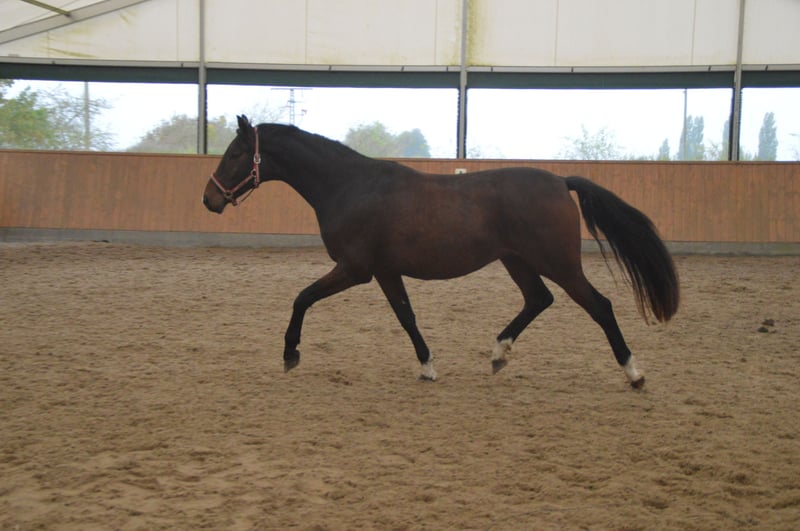 Hongre de 3 ans Par Fürst Wilhelm Coloration : brun foncé GGA réelle Le hongre est encore au stade brut. Il est vendu bien en dessous de sa valeur en raison d’un problème de santé.