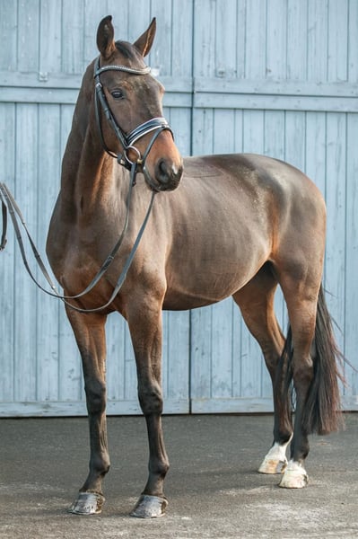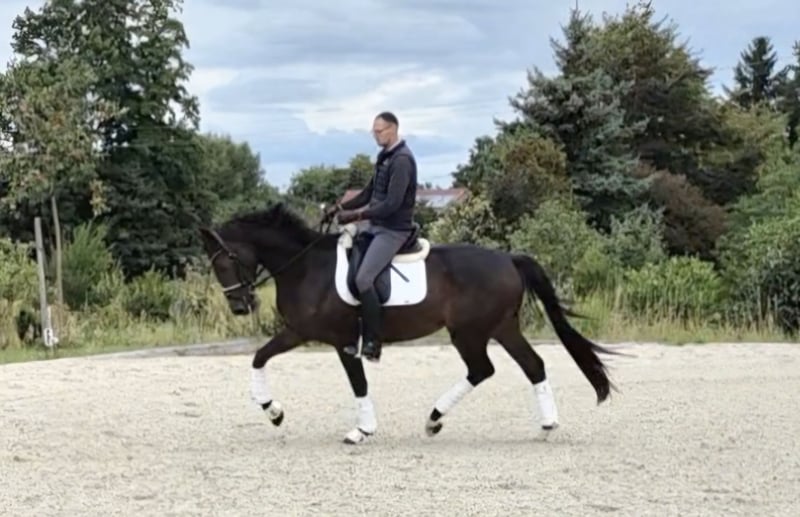 For sale is Bonegro, a beautiful Oldenburg gelding born in 2021. With his elegant dark brown coat and a height of 16.1 hh, he is a real eye-catcher. This talented gelding shows great potential in dressage and is ready to be further developed. He impresses not only with his relaxed basic gaits but is also very well-behaved, easy to ride, and has a high willingness to learn. He has already placed in dressage horse tests at the A level after a short time and is uncomplicated at competitions. He is suitable for both leisure and competition riding. From the direct maternal line, numerous horses have been successful in dressage at the M and S levels with amateur riders. If you are interested or need further information, please feel free to contact me. Video available via WhatsApp. Don't miss this opportunity to find a promising and reliable partner for the future!