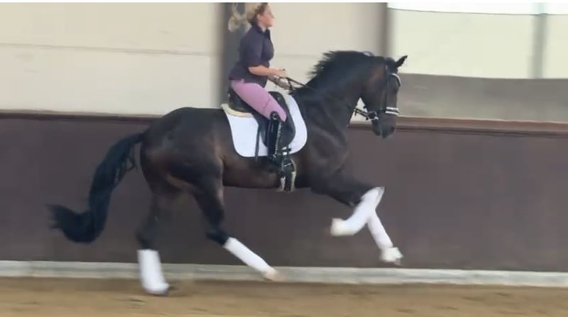 Hoch veranlagtes Dressurpferd mit Top Charakter. Auch von reitern ohne Jungpferdeerfahrung zu reiten. Sehr aktive und tragende Hinterhand. Bietet spielerisch schon viel von alleine an. Mehrfach Reitpferde mit Noten bis 8.5 Platziert. Nur in fördernde Hände zu verkaufen! Sehr brav im Umgang und auf dem Tunier.