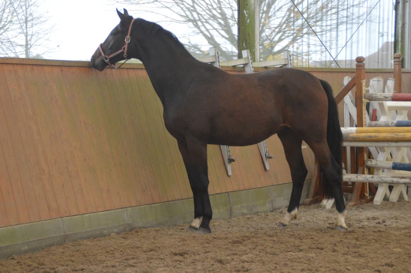 Hongre de 3 ans Par Fürst Wilhelm Coloration : brun foncé GGA réelle Le hongre est encore au stade brut. Il est vendu bien en dessous de sa valeur en raison d’un problème de santé.