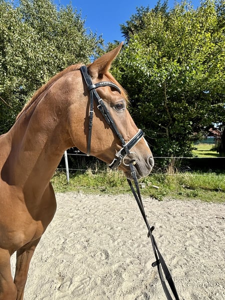 For sale is my beautiful Oldenburg gelding by Best of Gold. He is 7 years old and 1.65m tall. In terms of character, he is a cuddly and affectionate guy. In the arena, he is eager to learn and not too forward. He does test new riders a bit, but with some consistency, this is quickly resolved; he is never malicious. He still needs a clear and experienced hand, making him unsuitable for beginners. Thanks to his father Best of Gold, who has already placed highly up to Prix St. Georges, he brings good dressage genes. Under saddle, he presents himself very well, and due to his excellent gaits, he is definitely suitable for further dressage training. He still lacks a bit of routine in the field. However, he already handles spook training, tractor training, etc., very well. He is currently kept in a paddock with 2 other horses, but box housing is also not a problem for him. He is rather high-ranking. Otherwise, he is healthy, with no allergies or similar issues. He is barefoot. In 2022, he was completely X-rayed with no findings. Farrier work and trailer loading are not a problem. Unfortunately, I have to part with him due to time constraints, as I simply cannot do him justice because of my job. Videos and additional pictures can be sent via WhatsApp. Viewings and trial rides are of course possible with serious interest.