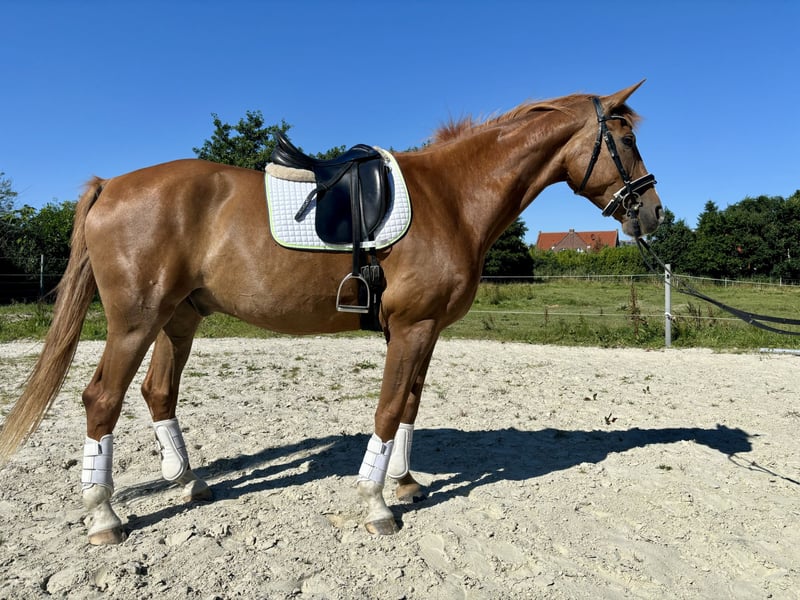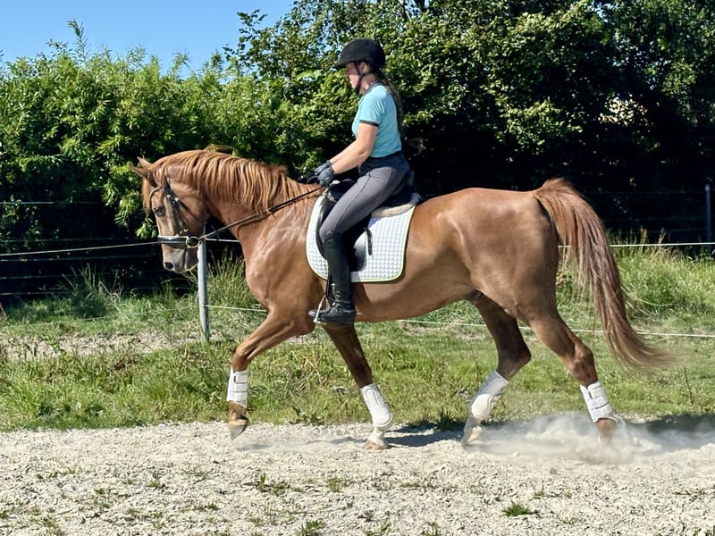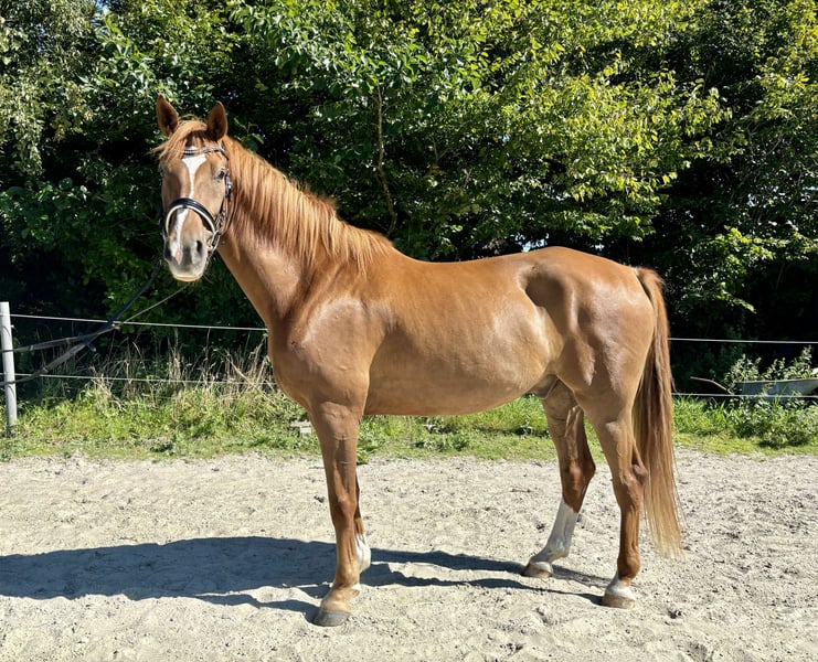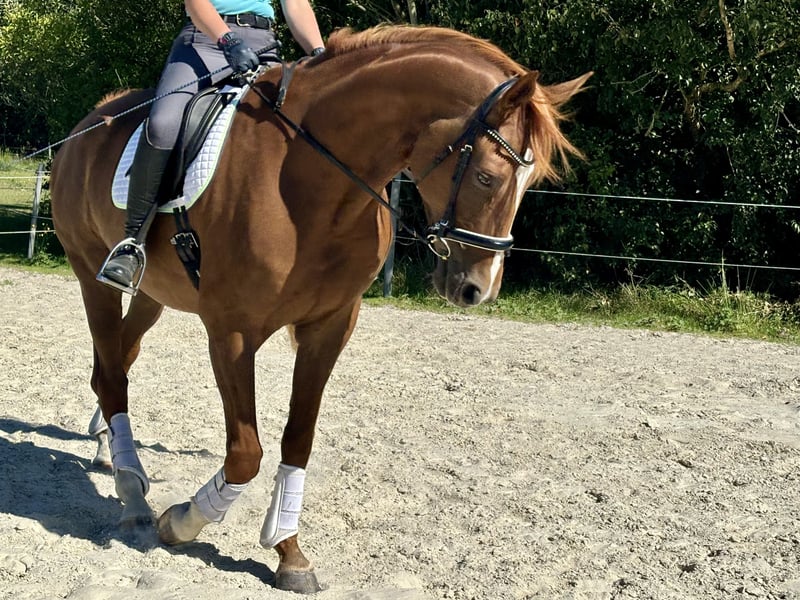 Zum Verkauf steht mein wunderschöner Oldenburger Wallach von Best of Gold. Er ist 7 Jahre alt und 1,65m groß. Charakterlich ist er ein verschmuster und anhänglicher Kerl, auf dem Platz ist er lernwillig mit nicht zu viel Go. Neue Reiter testet er ein wenig aus aber mit etwas Konsequenz ist dies schnell geklärt, böswillig ist er dabei nie. Er braucht dennoch eine klare & erfahrene Hand und ist dadurch nicht für Anfänger geeignet. Durch seinen Vater Best of Gold der bereits hochplatziert bis Prix St. Georg ist bringt er gute Dressur Gene mit. Unterm Sattel macht er eine super Figur und durch seine tollen Gangarten ist er auf jeden Fall für eine weitere Dressur Ausbildung geeignet. Im Gelände fehlt ihm noch etwas Routine. Schrecktraining, Treckertraining usw. meistert er aber bereits sehr gut. Bei mir steht er mit 2 Pferden zusammen im Offenstall, Boxenhaltung ist für ihn aber auch kein Problem. Er ist eher ranghoch. Ansonsten ist er gesund, keine Allergien o.ä. Barhufer. 2022 wurde er komplett durch geröntgt ohne jeglichen Befund. Hufschmied und Hänger fahren sind kein Problem. Leider muss ich ihn aus zeitlichen Gründen abgeben, da ich ihm berufsbedingt einfach nicht gerecht werden kann. Videos und weitere Bilder können gern per Whats App verschickt werden. Besichtigung und Probereiten ist bei ernsthaftem Interesse natürlich möglich.