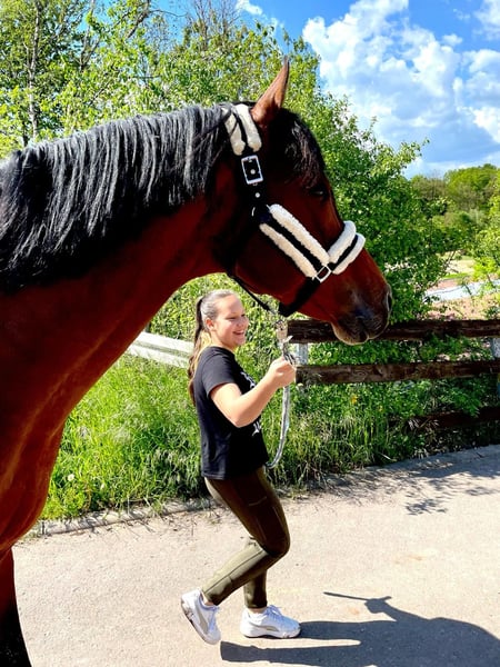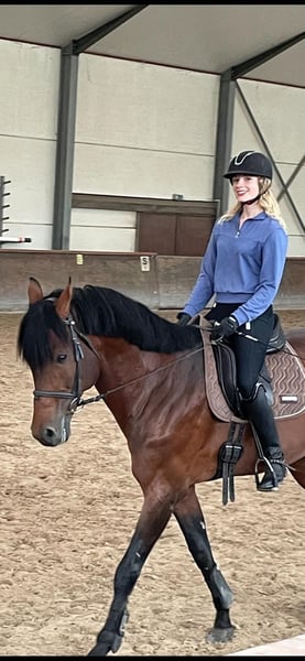 I have had Leon for 10 years. He has never exhibited stallion behavior, often stands beside mares or goes out riding with them. He has never been ill. At age 6, he sustained a kick injury in the pasture, which caused chips to form. These were completely removed through surgery. Since then, he has been regularly ridden for leisure. A few weeks ago, he competed in a beginner-level dressage and a beginner-level jumping class with a novice rider, and he placed in both! He really enjoys going out on rides. Generally, he is a rather relaxed and easygoing companion. Therefore, he is very well suited for a nervous rider or a beginner. He is very friendly, very handsome, well-behaved in handling, shoeing, and loading, and one of his favorite activities is definitely munching on lots of hay 😄 Space is more important than price.