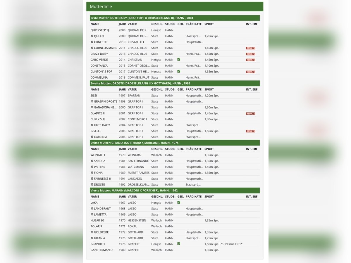 Zum Verkauf steht ein brauner Hengst vom 11.05.2024 von Qlassic Touch aus einer Quidam de Revel Mutter. Der Vater Qlassic Touch überzeugt derzeit mit seinem Reiter Reto Weishaupt mit herausragenden Noten im Youngstar-Sport. Die Mutter Queen (Staatsprämienstute, Freispringen 9,0) entspringt einem der besten Stämme der Hannoveraner Springzucht (Züchter Joachim Schwarze). Aus diesem Stamm waren zahlreiche Pferde international bis 1,55m erfolgreich.