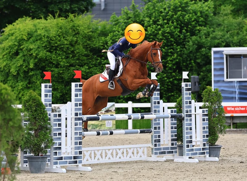 C Trentina, sire C-Trenton Z / dam's sire Landor S is a stylish Oldenburg chestnut mare, born in 2014. She has a height of 164 cm and shows great potential in show jumping. Overall, she is very versatile and talented. She impresses with her gentle nature and willingness to please. She has competition experience up to 115 cm (training up to 135 cm), is loading-friendly, farrier-friendly, and can go both alone and with company in the terrain. She has no bad habits such as rushing, bucking, or rearing, but is quite spirited and requires a confident rider who can handle a sensitive horse, as she can be somewhat spooky. She has no health issues and has never suffered from injuries with lasting effects. She has been regularly treated by osteopaths and chiropractors and has also undergone regular magnetic field therapy. The mare is prone to head-shaking and exhibits a strong toe-in gait in the hind legs, which causes her hock to rotate outward when walking. However, this does not cause her any health problems, limit her or require special treatment. Due to these two aspects, the price is negotiable.