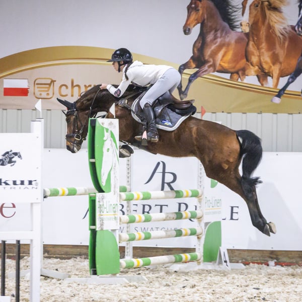For sale a young pony with the potential and quality for the highest level. Checky has been in training for a year (with us). She has already won the 90cm competition and successfully started competing in the 1m class. She has a wonderful jumping technique with a large gallop. Her full pedigree includes horses up to 1.60m level! She is not suitable for beginners, as she is soft in her mouth and is afraid of horses during warm-up. She jumps everything, easily goes to the horsetruck, rides in the forest, and spends time in the paddock daily. She has excellent X-rays from two years ago. If you are experienced and are looking for a young pony to develop with the potential to compete in European Pony Championships, Checky is the right choice. I'd be happy to send you videos via WhatsApp; they're too long to post here: +48693895779