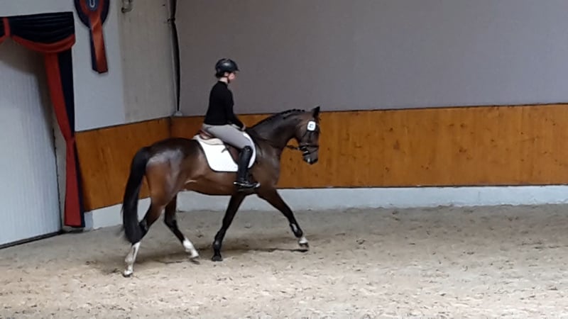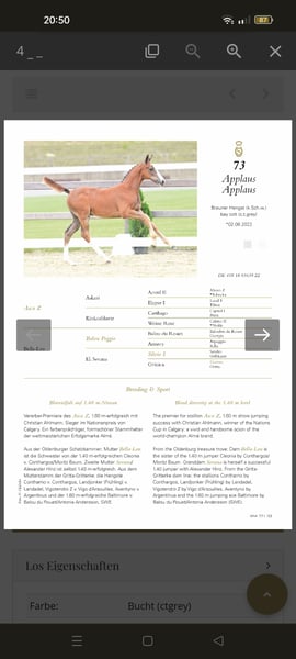 We are selling our beloved 8-year-old OS-registered show jumping mare by Balou Peggio with a premium status from the OS Verband, out of the S**-winning elite mare Sevana by Silvio I – Cosinus – Vollkorn xx – Manolete xx. We bred and trained the mare ourselves. At four years old, she foaled a top-quality stallion prospect by Asca Z for the autumn elite auction in Vechta. Due to her excellent rideability, character, and size (16.1 hh), she was intended to be the future mount for our 11-year-old daughter. Unfortunately, she sustained an injury two years ago (cartilage damage in the elbow joint – veterinary report available), which now prevents her from competing in show jumping. Primarily, we are offering her as a broodmare because of her excellent pedigree, but we could also see her as a wonderful leisure partner for fun riding (we haven't ridden her since last summer due to her injury). Only for good hands! No dealers!