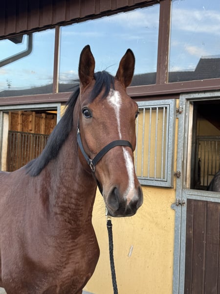 For sale is a 5-year-old gelding by Charthago Blue out of Argentinus x Grannus. Checker is a very well-behaved and trusting horse. He comes directly from the breeder, where he was gently backed. He is now in training for further education near Luhmühlen. He has three good basic gaits, and he has also jumped under saddle, showing both joy and talent. He is very eager to learn and has made significant progress in a short time. Since he is still in the early stages of training, he has no competition experience yet. Due to minor flaws, we are offering him at a significantly reduced price.