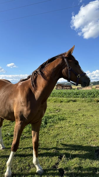 Ich verkaufe meine 2,5 Jähre Warmblutstute. Perfekt für jemanden, der sich ein Pferd selber ausbilden möchte. Da sie jetzt seit einigen Tagen aufgestallt ist, kann ich demnächst auch einmal ein Video machen. Habe bereits angefangen sie ein bisschen zu longieren. Sie ist sehr Menschen bezogen, lässt sich problemlos verladen, ist artig beim Hufschmied, lässt sich bereits anbinden und waschen und ist generell super unkompliziert und gelehrig. Ich verkaufe sie nur, da ich einfach zu wenig Zeit habe und ihr nicht gerecht werden kann. Platz vor Preis! Bitte keine Händleranfragen.