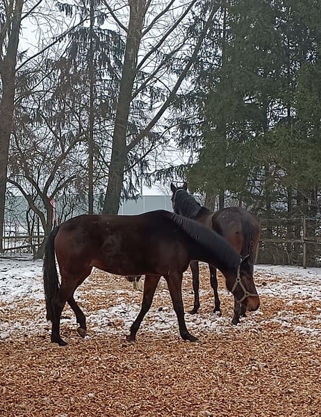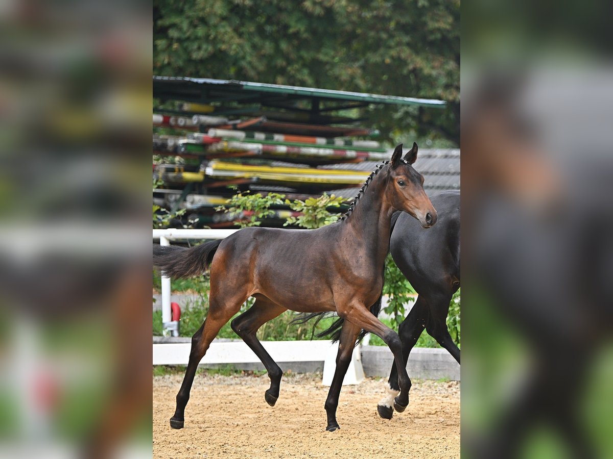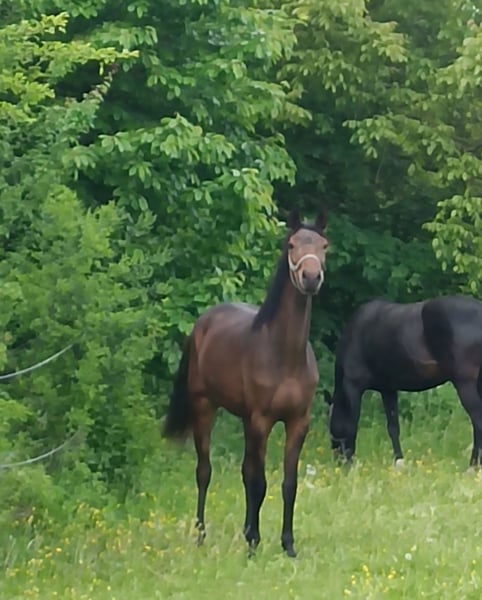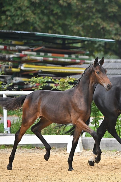 Kleiner familiärer Zuchtbetrieb mit 30jähriger Erfahrung in der Pferdezucht hat eine 3jährige dunkelbraune blutgeprägte Stute (ohne Abzeichen) für den Dressursport zu verkaufen: Damira von Fürsten-Look Pr.H. x Dancier x Sandro Hit x Lauries Crusador xx verfügt über 3 sehr gute GGA, ein trockenes Fundament, einen hübschen Kopf und eine gute Oberlinie. Ihr derzeitiges Stockmaß beträgt ca. 165 cm. Beim NÖ Fohlenchampionat konnte sie mit einer Gesamtnote von 9,2 den 5. Platz (9,5 für Typ und Bewegung) belegen und qualifizierte sich somit für das Bundeschampionat, wo sie mit einer Gesamtnote von 8,5 nur knapp den Endring verpasste. Ihr Vater Fürsten Look und seine zahlreichen Nachkommen sind vielfach siegreich in Dressurpferdeprüfungen (mehr Details siehe Website Hengststation Paul Schockemöhle). Ihre Mutter Daisy hat 2024 mit ihrem Halbbruder Escariano v. Escanto den Bundeschampion der dressurbetonten Hengstfohlen und mit dem Halbbruder Besito v. Bernay den Sieger der 4j. Materialpferde in NÖ gestellt. Die Stute ist sehr menschenbezogen und umgänglich, da sie in einer kleinen gemischten Herde aufgewachsen ist, und ist derzeit noch roh. Trotzdem ist sie aufgeweckt und bewegungsfreudig. Selbstverständlich wird sie regelmäßig entwurmt und geimpft, und auch bei der Hufbearbeitung benimmt sie sich ganz vorbildlich. Sie kennt Boxenhaltung mit täglichem bzw. ganztägigem Koppelgang. Standort der Stute: westliches NÖ Nähe Amstetten (zwischen Linz und Wien). Weitere Auskünfte gerne telefonisch.