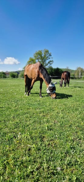 Hallo, schweren Herzens verkaufe ich meinen 15 Jährigen Wallach Non Plus Ultra kurz gesagt Noni. Er liebt Ausreiten über alles und zeigt sich dabei besonders ruhig und brav. Mit etwas Vertrauen geht er auch gerne alleine ins Gelände, ebenso zuverlässig ist er in der Gruppe, egal an welcher Position. Hier ist er wirklich ein Pferd für jedermann. Auch die Bodenarbeit macht ihm große Freude: motiviert, aufmerksam und mit Spaß an der Sache. Auf dem Reitplatz braucht Noni allerdings einen erfahrenen Reiter. Für Anfänger ist er hier nicht geeignet, da er eine klare, ruhige Hilfengebung schätzt. Hier bringt er sehr viel GO mit. Aufgrund seiner Diagnose Kissing Spines kann Noni nicht mehr gesprungen werden. Dies beeinträchtigt ihn im Alltag jedoch nicht - er kommt damit gut zu recht. Charakterlich ist Noni ein absoluter Schatz, total verschmust, menschenbezogen und für jeden quatsch zu haben. Da ich mehr in den Springsport gehen möchte, suche ich für Noni ein liebevolles Zuhause, in dem er geschätzt wird und weiterhin abwechslungsreich beschäftigt weden darf, besonders im Gelände und in der Bodenarbeit.