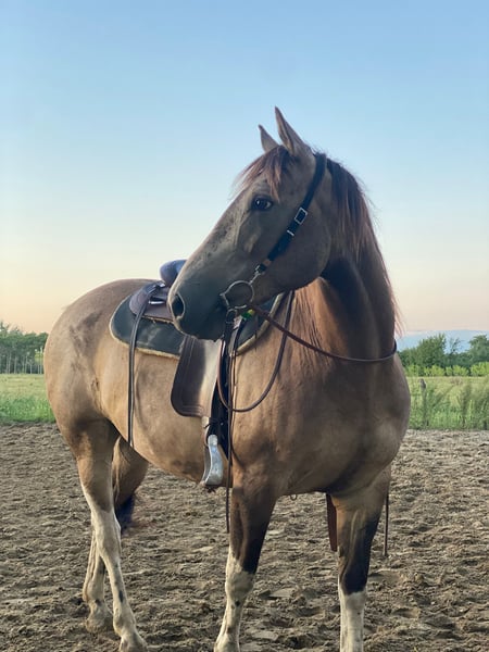 À la recherche de votre prochain partenaire sur le sentier ou dans l'arène ? Rencontrez ce magnifique hongre Paint Tobiano Dun enregistré APHA - JESSE - un véritable gentleman à tous égards. À 8 ans, il a le parfait équilibre entre expérience et énergie. Ce hongre allie une apparence frappante à une personnalité merveilleuse. Il est très amical, facile à manipuler et n'a pas de mauvaises habitudes. Sous la selle, il est monté aussi bien en intérieur qu'en extérieur sur le sentier, ce qui en fait un partenaire polyvalent et agréable. Dans le troupeau, il a une nature décontractée et s'entend sans conflit. Il est habitué à vivre à l'extérieur jour et nuit, ce qui le rend robuste et sans complications. Il mesure 1,55 m (mesuré avec un bâton). En ce qui concerne les soins, il est excellent avec le vétérinaire et le maréchal-ferrant, et monte dans le van sans problème. Sa belle couleur Dun Tobiano fait de lui un véritable accroche-regard où qu'il aille, et son tempérament doux en fait un plaisir à travailler. Prix : 8 800 € Nous le vendons car ma fille a choisi un hongre AQHA pour la compétition, donc nous n'avons pas de place pour Jesse. Il mérite un foyer aimant où sa douce nature et ses talents peuvent vraiment briller. Il est activement monté à partir d'aujourd'hui, venez l'essayer. Si vous recherchez un Paint fiable, gentil et polyvalent avec une couleur époustouflante et d'excellentes manières, ce hongre pourrait être votre match parfait. Contactez-moi (+421 945 461 918) pour plus de détails, photos ou pour organiser une visite. Le cheval est situé en Slovaquie, à 60 km de Bratislava.