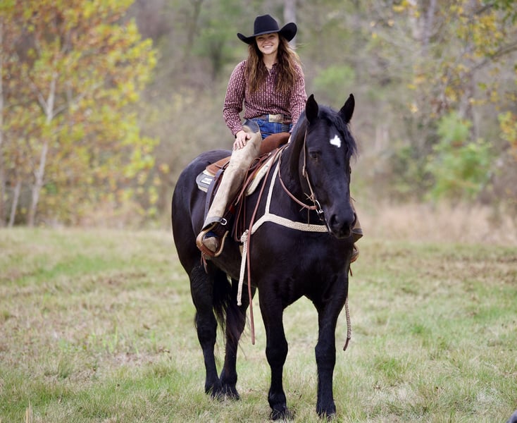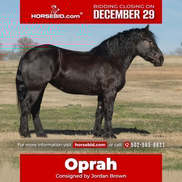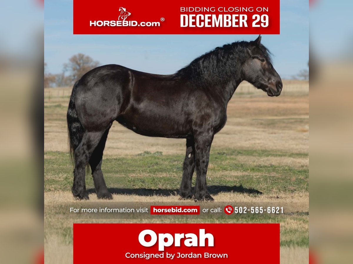⚜️𝐓𝐇𝐄 𝓗𝓮𝓻𝓲𝓽𝓪𝓰𝓮 𝐖𝐢𝐧𝐭𝐞𝐫 𝓒𝓵𝓪𝓼𝓼𝓲𝓬⚜️ Happening now thru MONDAY | DECEMBER 29th - Available EXCLUSIVELY on HorseBid's website! For more details and to register visit: www.Horsebid.com CONSIGNOR CONTACT: Jordan Brown 502-565-6621 LOCATION: Georgetown Texas BREED: Percheron REGISTERED: No COLOR: Black HEIGHT: 17 h AGE: 4 GENDER: Mare Let’s talk about the elephant in the room… Oprah is certainly not going to be looked over in any environment! She brings class, dignity, and athleticism to every discipline and atmosphere! From trails to the show ring this mare is game for anything you throw at her! Super fun and friendly, always the first to greet you and will hang around for more scratches after you turn her loose! Quiet and easy to handle, picks up all feet, leads, loads, ties, bathes. A saint on the trail. Will ride anywhere in the group, rides out alone as well. Crosses water, fallen timber, ditches, steep terrain, bogs, thick brush, and extremely traffic safe. Has been ridden quite a bit on the road and through the parks with bicycles zooming around and is very desensitized to pets thanks to our herd of dogs (and barn cat whom she sleeps with every night) We have thrown a dressage saddle on her and she floats around like a dream! Oprah is so much fun to have around and makes new friends everywhere she goes! Would love to find her a family to enjoy and spoil her! Would even take to jousting, mounted patrol, and therapeutic riding with her manners and kind soul!