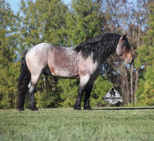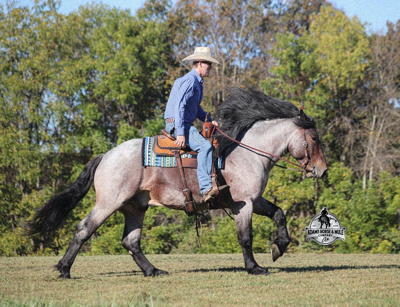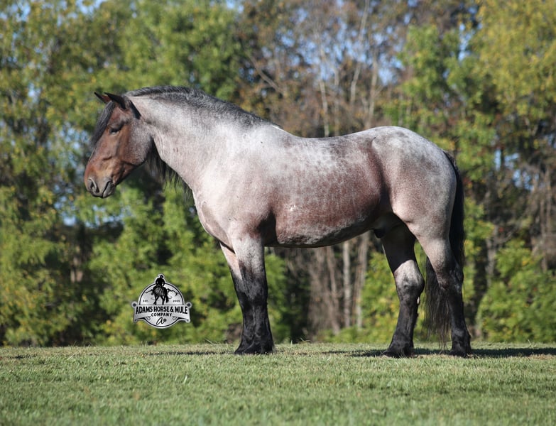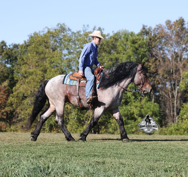 Go to visit our website for more pics and a video www.AdamsHorseAndMuleCo.com AHAMC has been in the horse business and sold horses over the internet since 2005. We have a long track record of success with hundreds of happy customers. We work hard to match riders with the correct horses and specialize in beginner safe, family friendly horses that have been used and checked out by our family! We can set up transportation anywhere in the US and look forward to working with you.Kodiak looks like something straight out of a fairy tale with his HUGE mane and tail, high contrast roan coat, he is for sure a very unique Draftcross gelding! He is a beautiful bay roan that is weighing in around 1400lbs and stands around 16H+! He is 5 years old and is very well built. Kodiak has been ridden around the ranch, checked cows and rode fences. He is a slow and laid back type of horse that will just ease along down the trails with no hesitation. He is a horse that the whole family will love and one that will help build everyone’s confidence levels! He has been camping in several states and has been ridden by all ages of beginners and kids as well. When out on the ranch or going down the trails he will cross creeks, ditches, logs and navigate rough rocky areas. He has been worked under harness to all types of farm equipment and is traffic safe whether that be trucks or cars. He has a nice jog, his lope is slow, collected and very easy to set as he lopes nice circles! He has been exposed to all kinds of wildlife such as deer or turkey. Kodiak is the total package and he will take care of you! Feel free to call Eric 606-308-2461 with any questions!