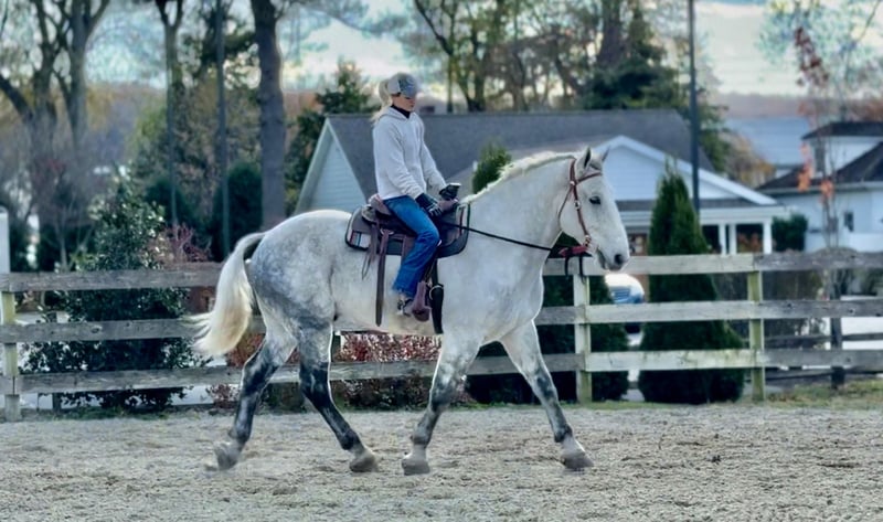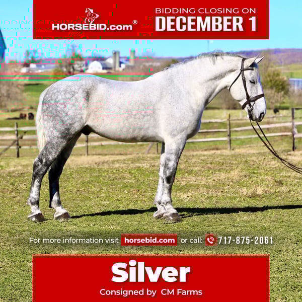 ⚜️ 𝓽𝓱𝓮 𝐇𝐨𝐫𝐬𝐞𝐦𝐚𝐧'𝐬 𝓢𝓱𝓸𝔀𝓬𝓪𝓼𝓮⚜️ Happening now thru MONDAY | DECEMBER 1st - Available EXCLUSIVELY on HorseBid's website! For more details and to register visit: www.Horsebid.com CONSIGNOR CONTACT: CM Farms 717-875-2061 LOCATION: Gap, PA BREED: Perch/QH REGISTERED: No COLOR: Grey HEIGHT: 17 AGE: 7 GENDER: Gelding Here’s the highlight of our year — meet Silver! The ultimate guest horse! This breathtaking horse is a 7-year-old Percheron/QHx gelding standing a sturdy 17hh. Silver was put together right — he’s got curves in all the right places, he is quite substantial, making him great for a variety of different riders, and his brain is simply unbeatable! He is broke to ride Western, English, bareback, and broke to drive single or double. He will lay down on command to mount or dismount! Although Silver is a big boy in every way, he is able to be athletic and has one of the cutest jumps in the barn. This guy has blown us away with not only his beauty, but his quiet, unfaltering mind, and we can guarantee he will do the same wherever he goes! Under saddle, Silver is hands-down one of the most fun and safe horses to ride! He’s so incredible — we have even ridden him bridleless at the walk, trot, and canter. He’s well educated with walk-to-canter transitions, he neck reins and direct reins, he moves off of leg, and he’s adjustable at all three gaits. His trot and canter are some of the most comfortable we’ve ever ridden — incredibly easy to sit — and at the canter he will make you feel like you’re on top of the world! He responds well to voice cues and will stop on a dime with just a “whoa” or by sitting back. He is fun for any level of rider because he does not get upset if you make a mistake or flop around, and he has enough buttons to keep things fun for someone more advanced. He is more of a push ride, and you can have plenty of leg on him; however, he’s always responsive when you ask him to go and will carry himself very well. This guy is so well balanced, steady, and willing to please. He is even able to canter little circles in both directions and leg-yield at all three gaits. He’s one you could take into the dressage ring tomorrow, and we don’t doubt he’d clean up the ribbons. On the trail, Silver keeps the same steady mentality. He’ll pack anyone you put on him with reliability, a sure foot, and a happy attitude. He’s the same horse off property as he is at home- and he’s the same horse EVERY time you pull him out. This handsome man has been everywhere — from cantering through open fields, going up and down windy wooded trails, through creeks, over bridges, and through tunnels — he’s even ridden right into town and through the drive-thru! You can take him to the grocery store, tie him up while you shop, and come back out to find him waiting patiently. He is unflappable, sturdy, and will lead, follow, or go anywhere you put him in the group. He doesn’t mind if another horse rides too close to him and seems to get along with everyone. Silver has been out on multiple hunter paces with us this past fall, and he would make an incredible candidate for fox hunting. This gelding is extremely honest to all the jumps, whether it be logs, coops, or even the silly inflatable kinds — point him in the right direction, and he will take care of everything else. He has also been cross-country schooling with us and proved himself to be extremely athletic and cute with his form and knees. He did the ditch combination with no hesitation — and if you are familiar with how difficult that is for some horses, that says a lot in itself! He is so big that when he takes a larger jump it feels like you’re popping over a crossrail. He’s jumped some sizable 3’–3’3” coops and could likely even do bigger! This guy will give you a feel like you’re floating on air, and his confidence truly will make anyone a better rider! In the barn, Silver is really just an oversized puppy dog. He loves people, loves being brushed, and loves getting any type of attention! Most importantly, he has good manners in his stall, to tack up, and on the ground. This giant love bug is the type of horse that will meet you in the pasture when he sees you coming- and is always happy to spend quality time with his person. Once you’re done riding him, he will follow you anywhere like a puppy — no lead rope required! He loads right into the trailer, gets along with everyone, and is genuinely such a fun horse to have in the barn. Staying true to his typical draft nature, the one area Silver could still use some work on is picking up his feet. Our farrier has used stocks with him, because it's easier on his back; however, even he said Silver has one of the best temperaments, and with just a couple more sessions and some practice, he wouldn’t need them anymore. This is something we are continuing to work on until he leaves. Special ones of his size, athletic ability, and incredible temperament do not come around very often — he is truly a once-in-a-lifetime type of horse. We have all fallen in love with him at our barn and cannot say enough good things about him. He will be your best friend, and the kind of partner you’ll never EVER be able replace.