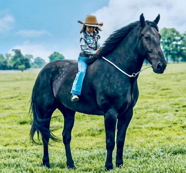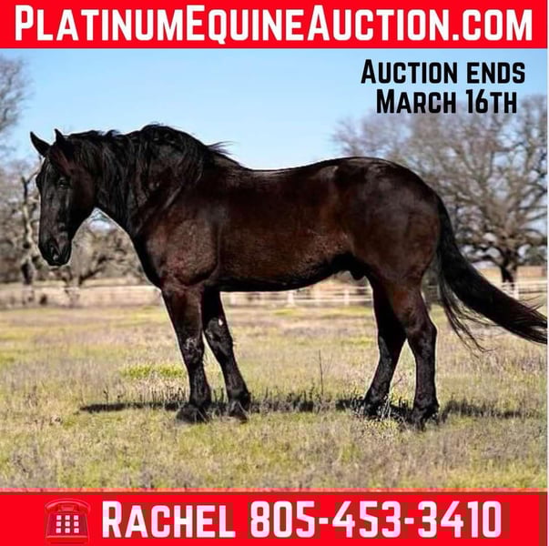 ONLINE AUCTION Place your bids at www.PlatinumEquineAuction.com Starting Bid $3500 Auction ends March 16th, 2025 Need a new saddle? Check out White Rock Saddles on our website or Facebook! Batman is a fancy, 7-year-old Friesian cross gelding, standing at 17.1 hands. I would consider him a once in a lifetime horse! Pictured is an 8-year-old girl riding him bareback with only a war bridle in his mouth while he is staying a complete gentleman the whole ride! This flashy, solid jet black gelding catches everyone’s attention everywhere he goes! He is by far one of the friendliest horses l’ve ever met or owned. I don’t think anyone ever told him that he is a horse and not a dog. While his personality is as big as he is, he will still be a respectful gentleman! “He is a really nice horse, if I was in the market this is the horse I would purchase” -DVM Tim Holt Batman is so light you can ride him in something as simple as a war bridle or even a rope around his neck! He’s so willing he will just about put the bridle in his mouth himself! He is soft in the bridle, side passes, moves off of leg pressure, rides out on a nice loose rein, has a big stop and picks up all gaits- BROKE & GENTLE for anybody. He is broke to ride western/ English AND drive! He bathes, clips, haro ties, cross ties, and is good for the farrier. He stalls well and does not crib, weave, pace, or kick. He stands quietly to be saddled, bridled, and mounted. He is Up to date on all shots-farrier-teeth and worming! Batman will lope off bridled up and as smooth as a rocking chair. I find him to be one of the most well trained- easy going & downright gorgeous Friesian crosses you can come across. This is a horse that is versatile and will be someone’s lifelong partner and best friend. Located in Post Oak Bend City, TX. Call Canyon Creek Ranch Rachel 805-453-3410 with any questions. ONLINE AUCTION Place your bids at www.PlatinumEquineAuction.com Starting Bid $3500 Auction ends March 16th, 2025 Need a new saddle? Check out White Rock Saddles on our website or Facebook!