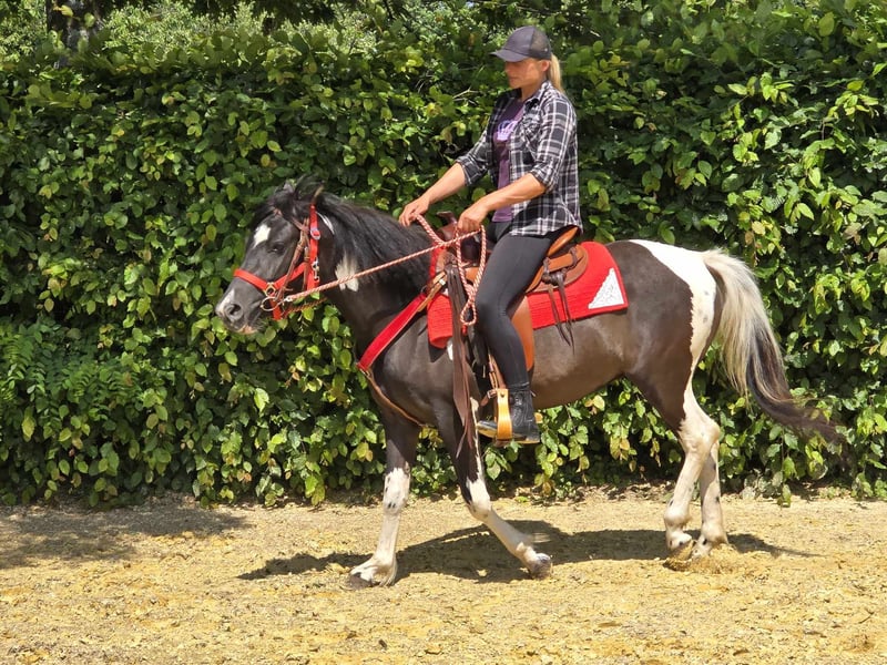 Freizeitstute „LEA “ Schecke -Pinto -Mix-Stute für Freizeit und Gelände* *Alter*: 4 Jahre angeritten und schon mal gefahren *Stockmaß*: ca. 1,36 m *Ausstattung*: E-Pass, Microchip und AKU vorhanden *Preis*: .4900 € * geritten und gefahren * Eine schöne Stute die sich ideal für das Gelände- und Wanderreiten eignet. Sie ist ein vielseitiges Freizeitpferd, das sowohl für englisches als auch für westliches Reiten bestens geeignet ist . Sie hat ein tolles, ausgeglichenes Wesen und fühlt sich in der Herde wohl, ist aber auch in der Box gut aufgehoben. ### *Das zeichnet sie aus:* - Offenstall- und Herdenhaltung gewohnt, Boxenhaltung ist ebenfalls kein Problem - Ideal für Freizeit- und Geländereiter - Sehr ausgeglichen und unkompliziert im Umgang *Interesse?* Rufen Sie uns gerne an unter *0171-4001968* (täglich von 8–20 Uhr). *Bitte keine Mails oder WhatsApp, nur Anrufe!* *Zusätzliche Informationen:* - Zubehör und Transport können günstig organisiert werden. - Unser Hofladen bietet eine kleine Auswahl an gebrauchten Westernsätteln. - *Ratenzahlung ist nicht möglich.* *Service für Kunden:* - Jeder Kunde erhält ein vertraglich festgesetztes *Umtauschrecht von drei Monaten.* - Ein Proberitt bei uns ist möglich, damit Sie Ihr Traumpferd kennenlernen können. Für 35 Euro können Sie reiten, sich ihn vorreiten lassen, spazieren gehen oder mehr. Auf Wunsch können Sie auch ein zweites Pferd testen für 25,- . Dieser Betrag wird beim Kauf eines Pferdes am gleichen Tag selbstverständlich verrechnet. *Besonderheiten:* - Bei sofortiger Abholung mit Pferdeanhänger erhalten Sie *einen Nachlass von 100 Euro.* - Wir absolvieren den Verkauf mit einem transparenten Proberitt, um sicherzustellen, dass es das richtige Pferd für Sie ist. *Rechtliches:* - Wir sind alleinige und uneingeschränkte Eigentümer der Bilder; die Bildrechte liegen bei uns. *Fremdverwendung der Bilder ist verboten.* - Bitte beachten Sie, dass es sich um ein lebendes Pferd handelt. Unsere Angaben basieren auf den Eindrücken des Betreuers und stellen keine zugesicherten Eigenschaften dar. - Anzeigen werden sofort gelöscht, sobald die Pferde verkauft sind. *Interesse?* Rufen Sie uns gerne an unter *0171-4001968* (täglich von 8–20 Uhr). *Bitte keine Mails oder WhatsApp, nur Anrufe!