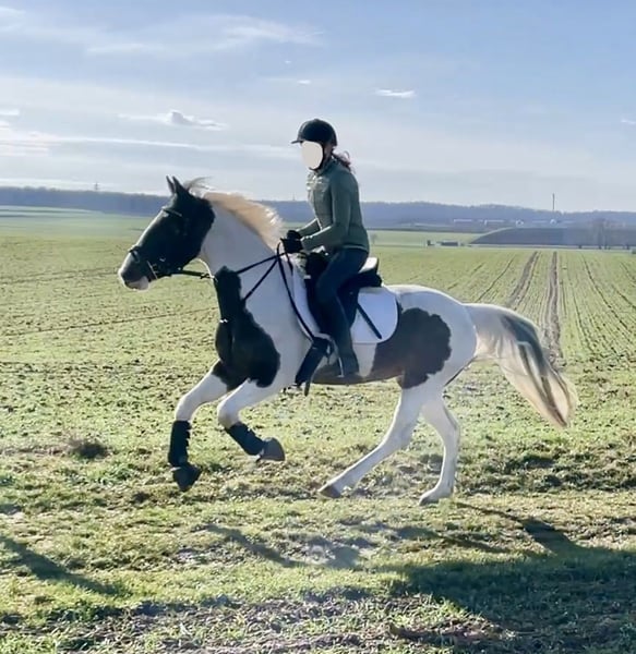Zum Verkauf steht eine 6-jährige Pinto Stute mit ca. 1,50 m Stockmaß. Sie fällt nicht nur durch ihre schöne Zeichnung auf, sondern überzeugt vor allem durch ihren ehrlichen und unkomplizierten Charakter. Unter dem Reiter zeigt sie sich brav und angenehm zu reiten. Sie geht alleine sowie in der Gruppe sicher ins Gelände und bleibt dabei stets kopfklar. Auch auf dem Platz/in der Halle arbeitet sie ordentlich mit und ist somit ein tolles vielseitiges Freizeitpferd. Vom Vorbesitzer wurde sie zudem gefahren. Weitere Infos: • brav im Umgang& unter dem Reiter • gesund • herdenverträglich • schmiede- und verladefromm • regelmäßig geimpft und entwurmt • Kinder- und Therapiegeeignet Gesucht wird ein passendes Zuhause bei Menschen, die ein ehrliches und unkompliziertes Pferd suchen.